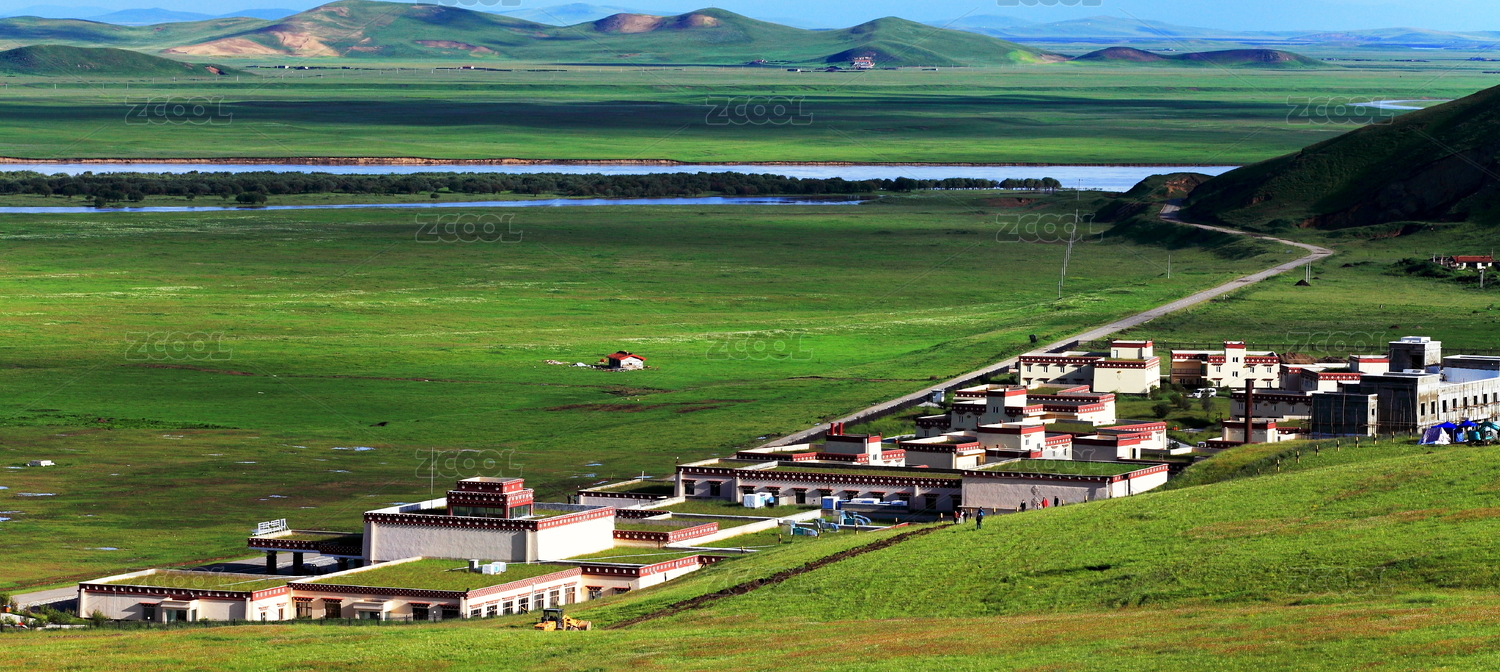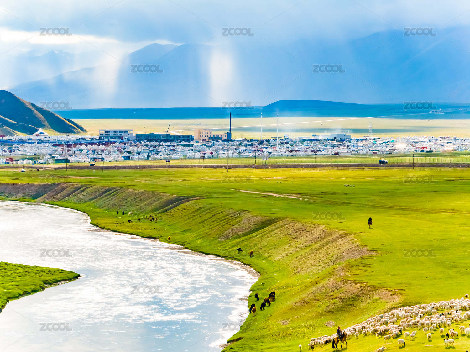四川省阿坝九曲黄河第一湾草甸草原上的牧场俯拍