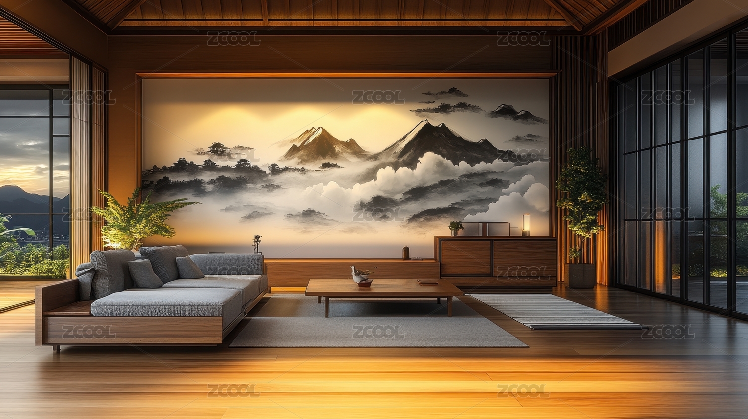 中式,山水画,墙面,浅米色,灰色,色调,客厅,现代,木质,家具