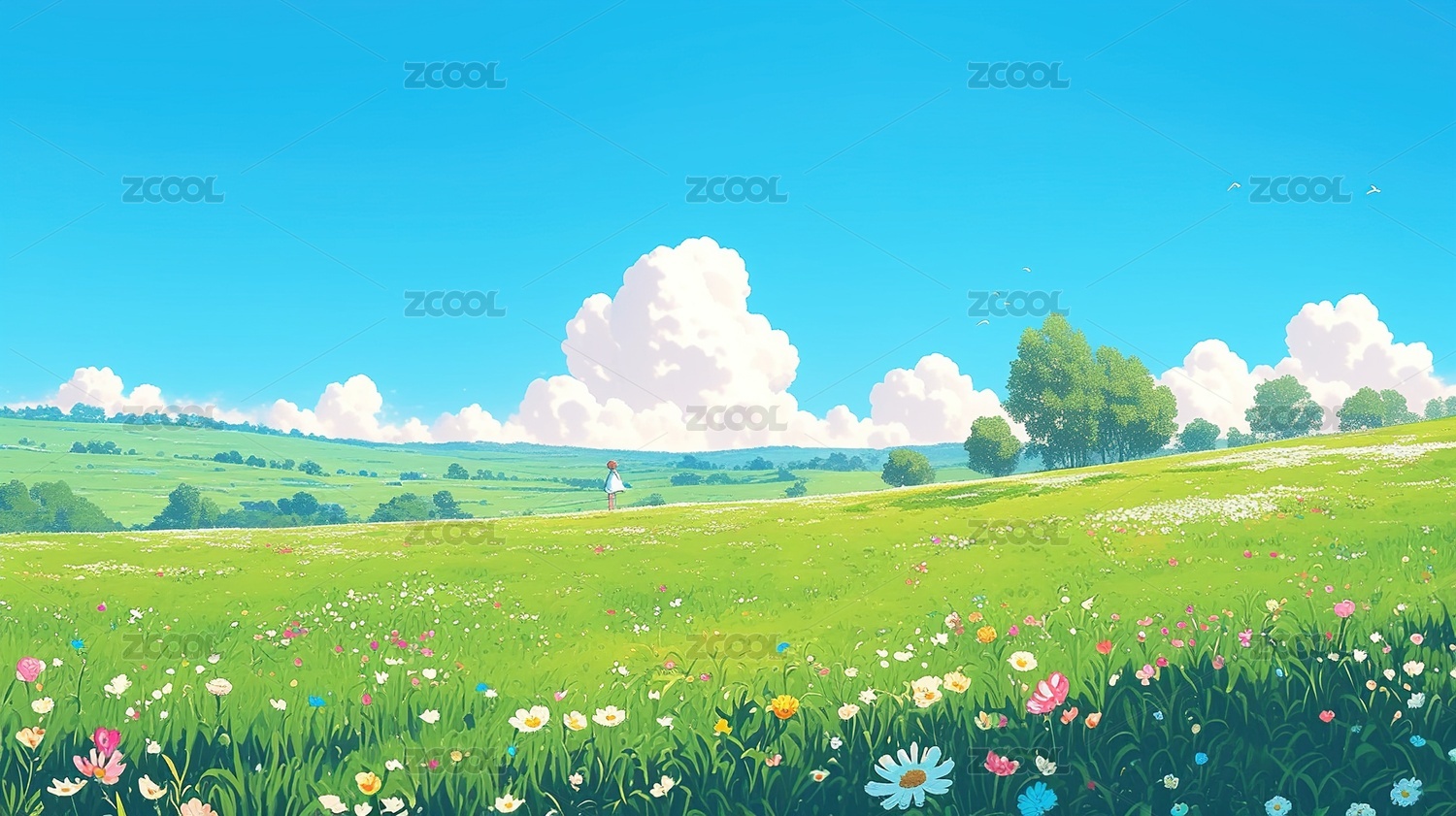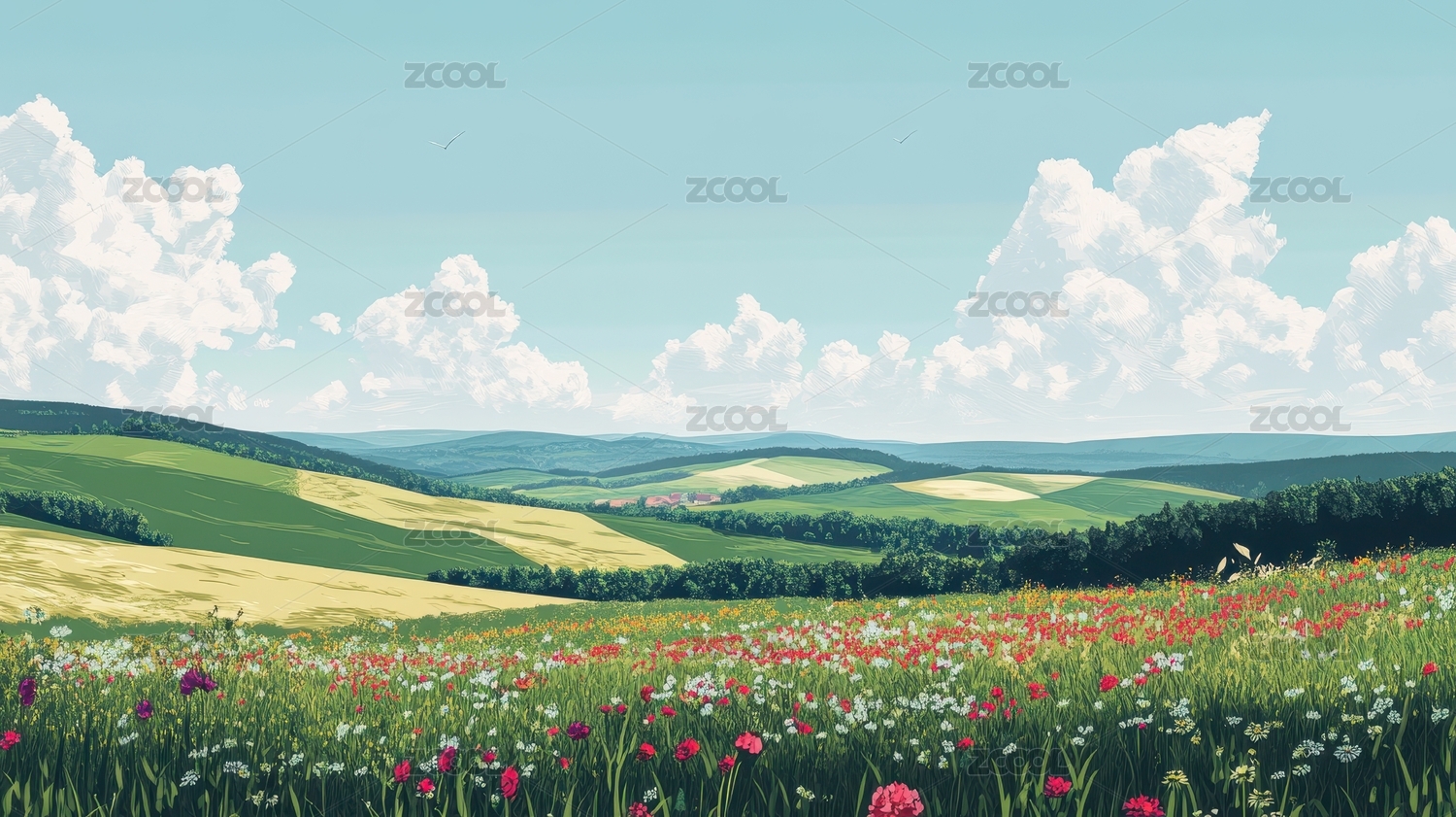 插画,旅行,旅游,AIGC202404,白云,雪山,山谷,草原,出行