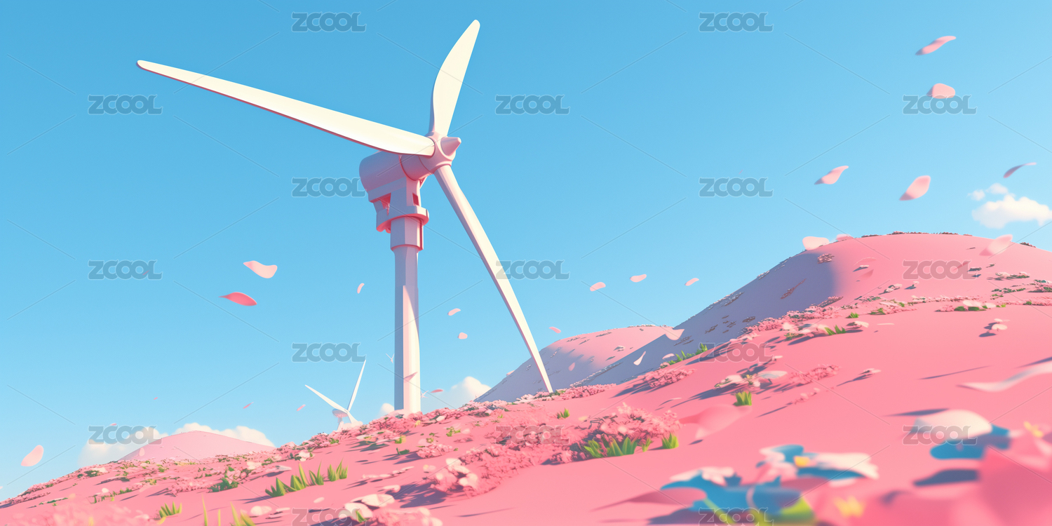春天鲜花盛开山顶的风力发电机3D卡通插画