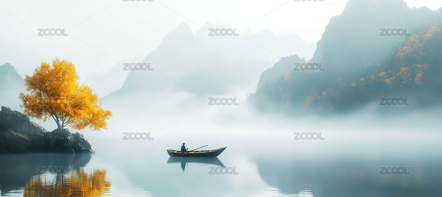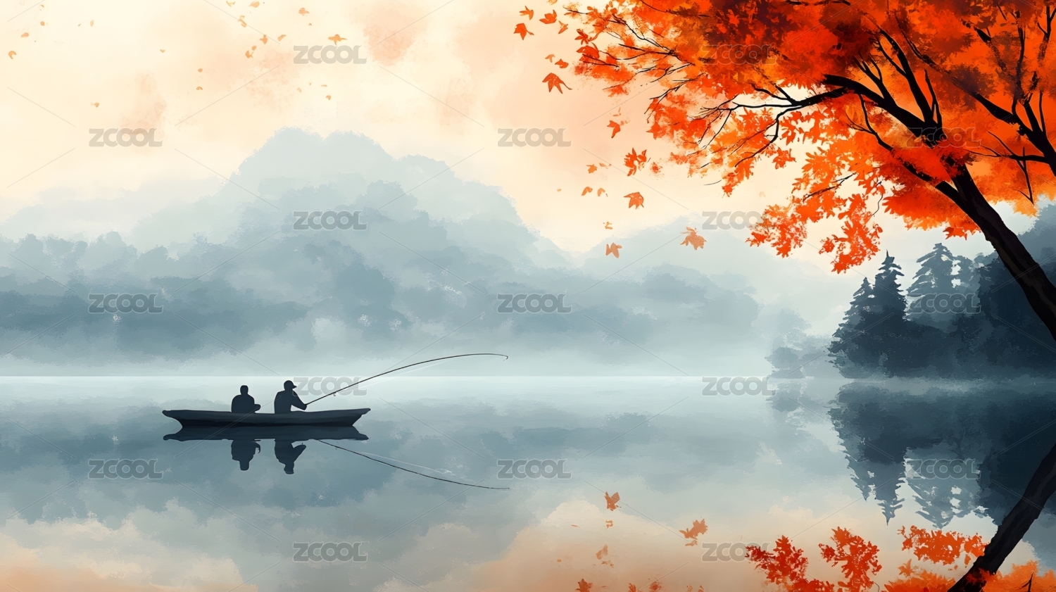 秋天,湖面,雾气,枫树,橙色叶子,小船,蓝天,宁静氛围,自然风光,柔和灯光