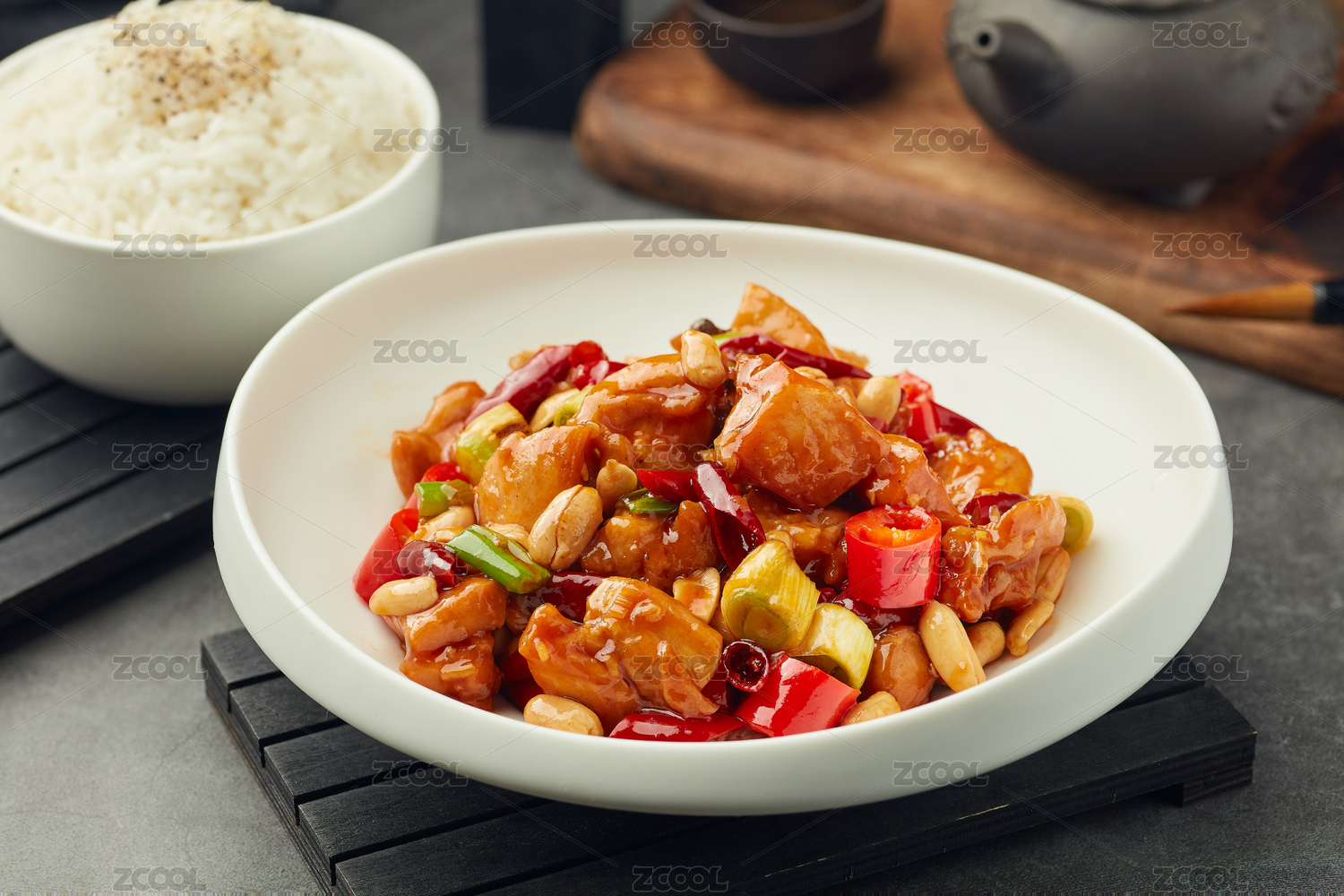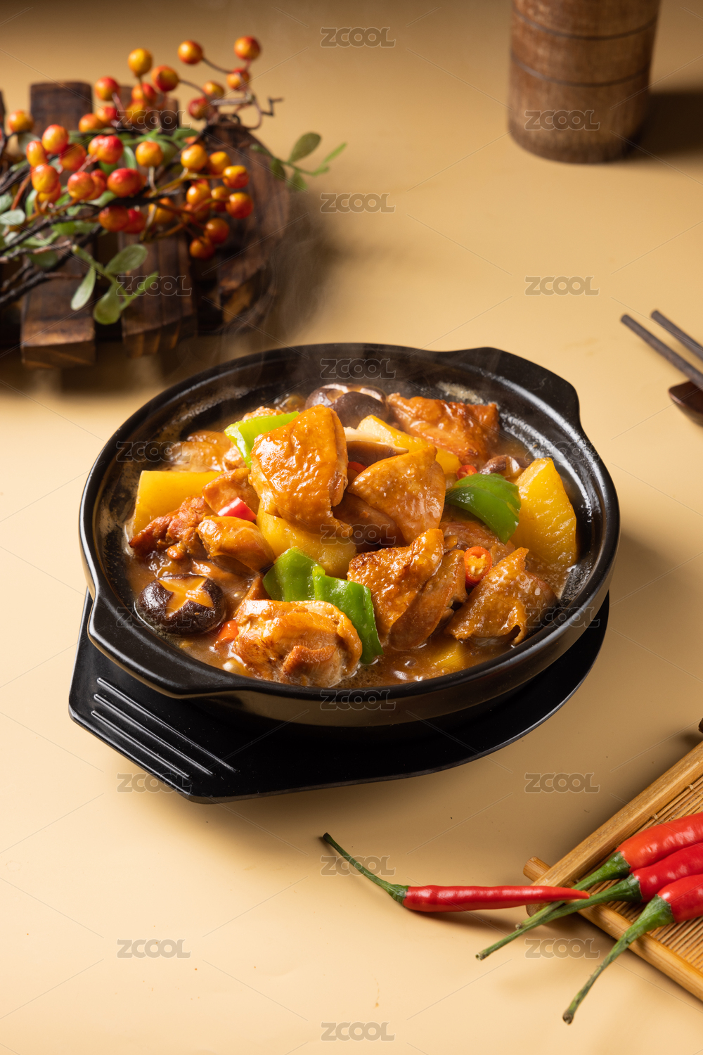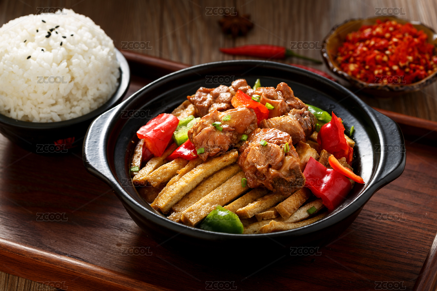 美食,黄焖鸡,鸡块,米饭,青红椒,米椒,米椒碎,木盘,托盘,木勺
