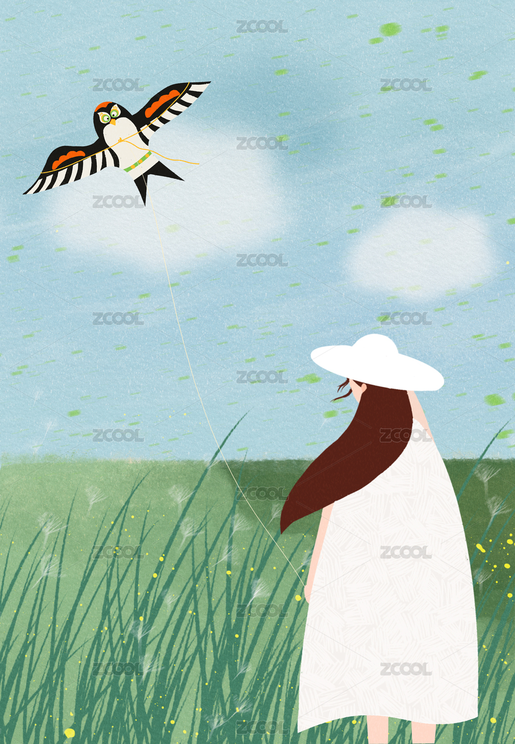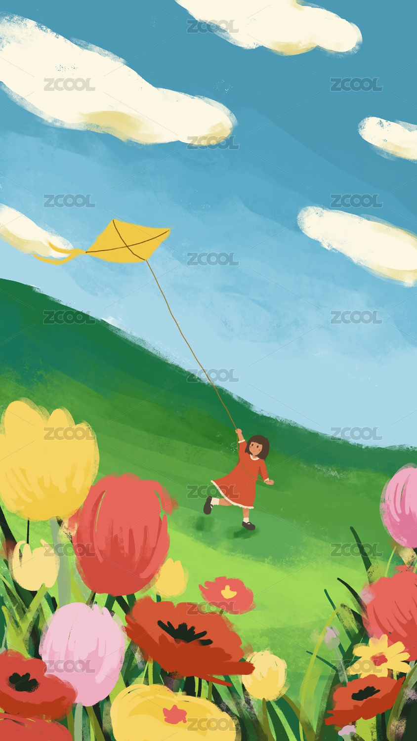 少女,鲜花,山坡,草地,风筝,春天,插画
