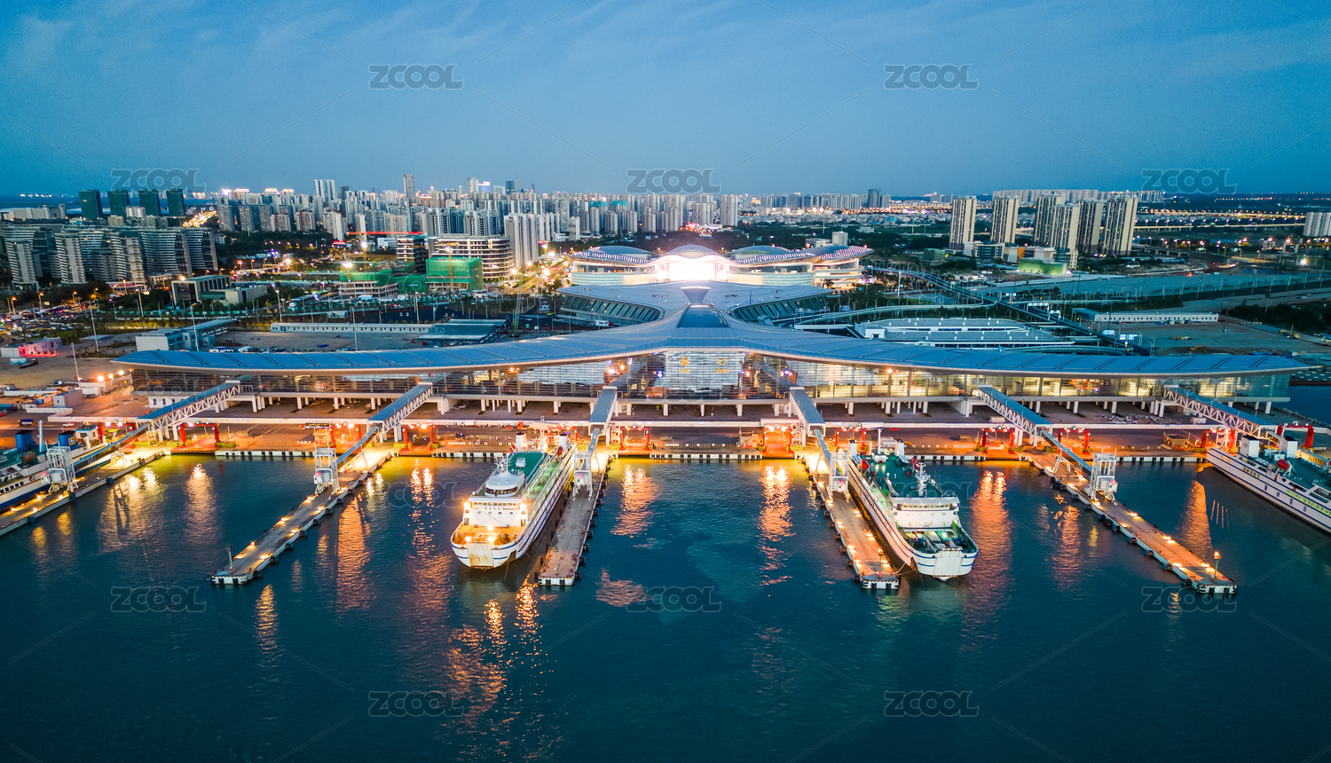 海南海口新海客运枢纽港口高视角航拍夜晚蓝