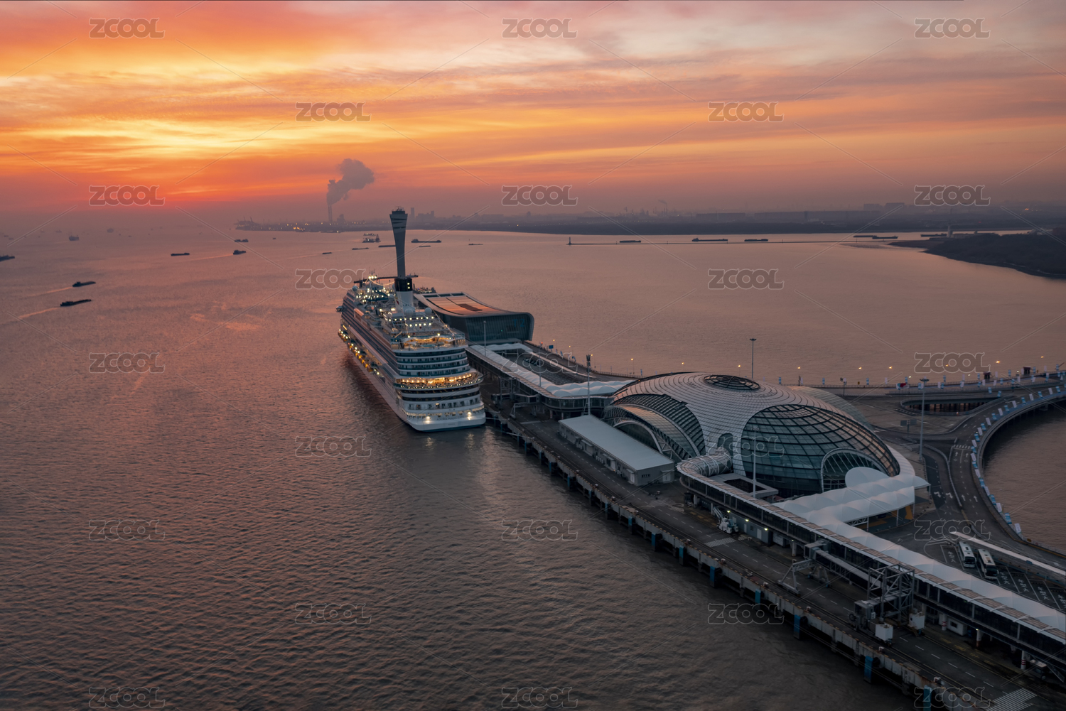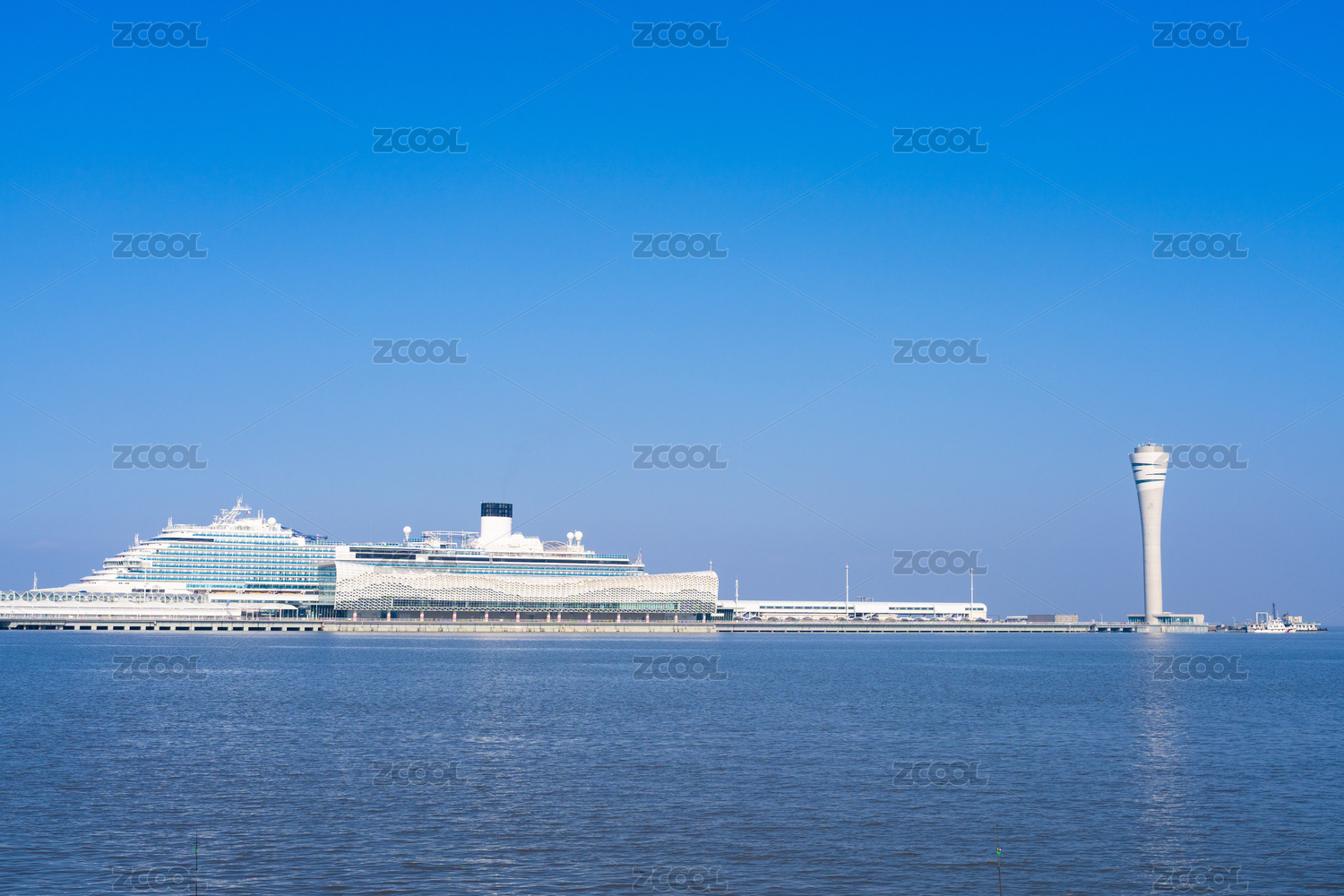 上海吴淞口国际邮轮港的邮轮和瞭望塔