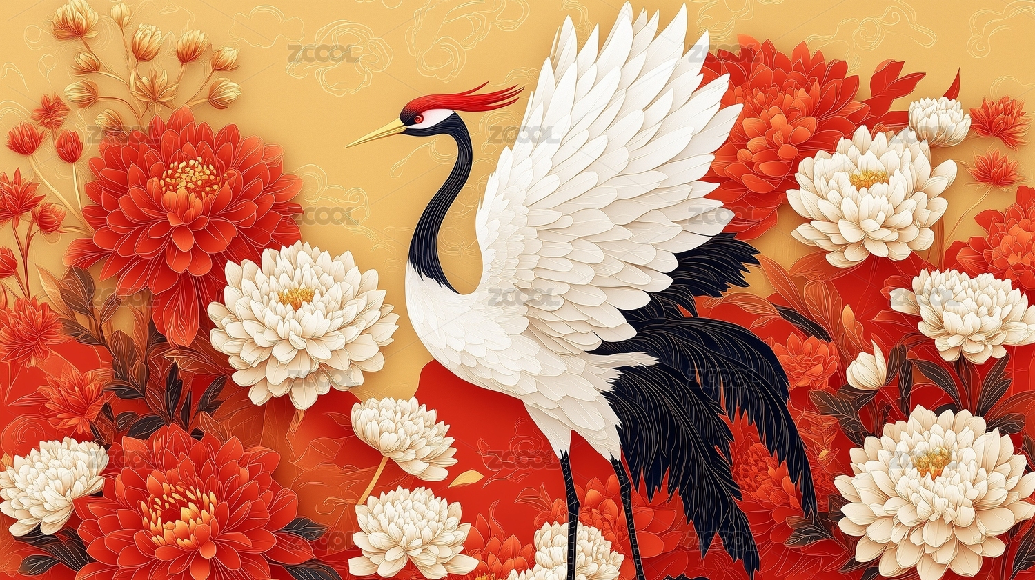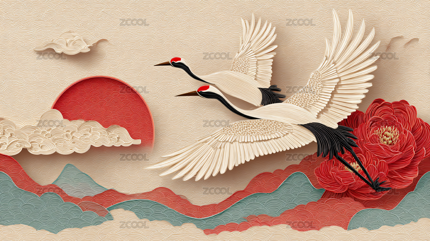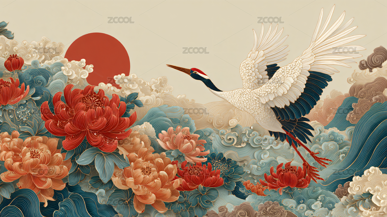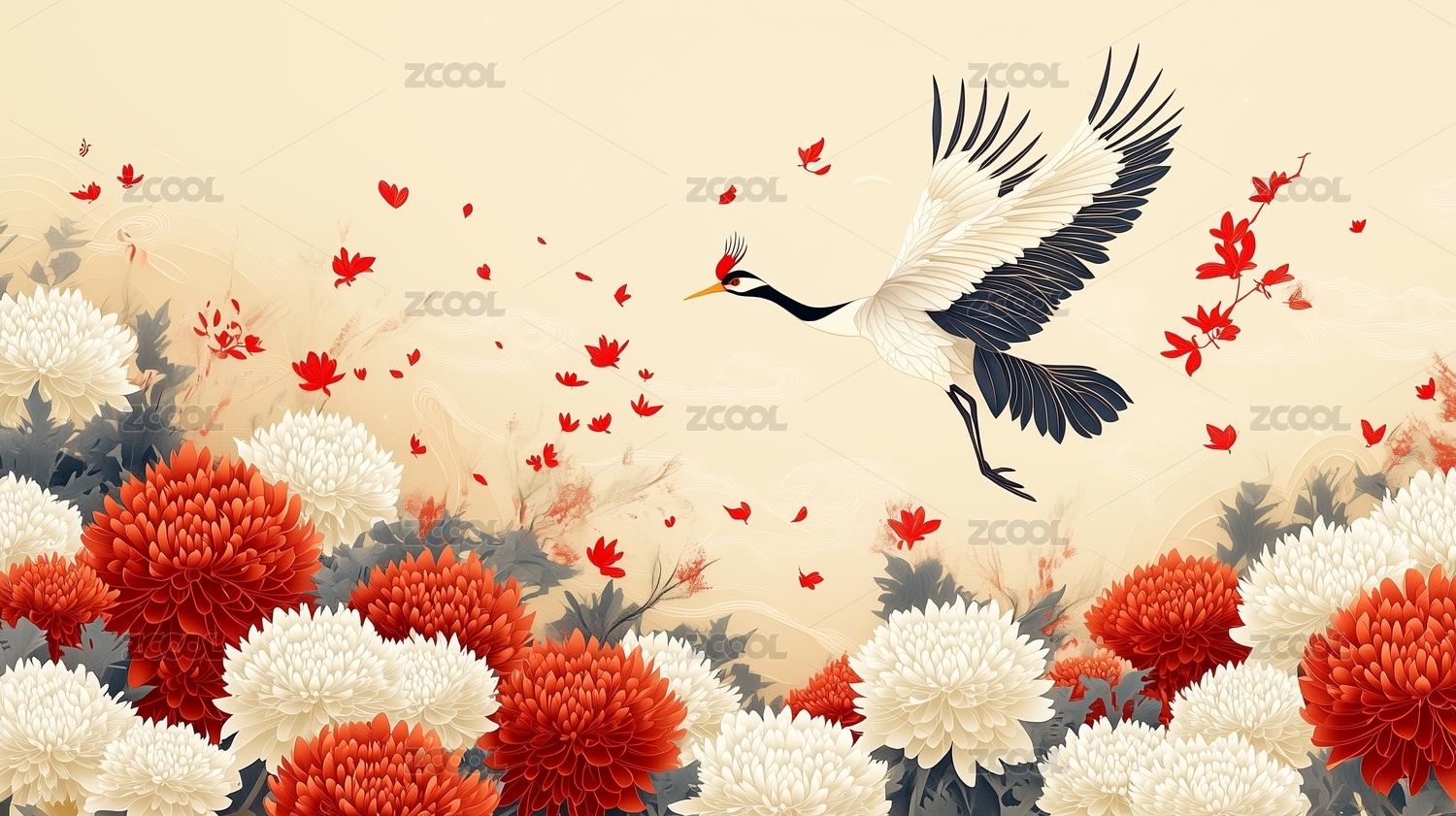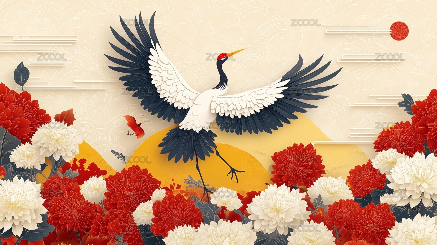 AIGC202406,重阳节,菊花,仙鹤,浮雕,登高节,中国风,剪纸风,插画,风景