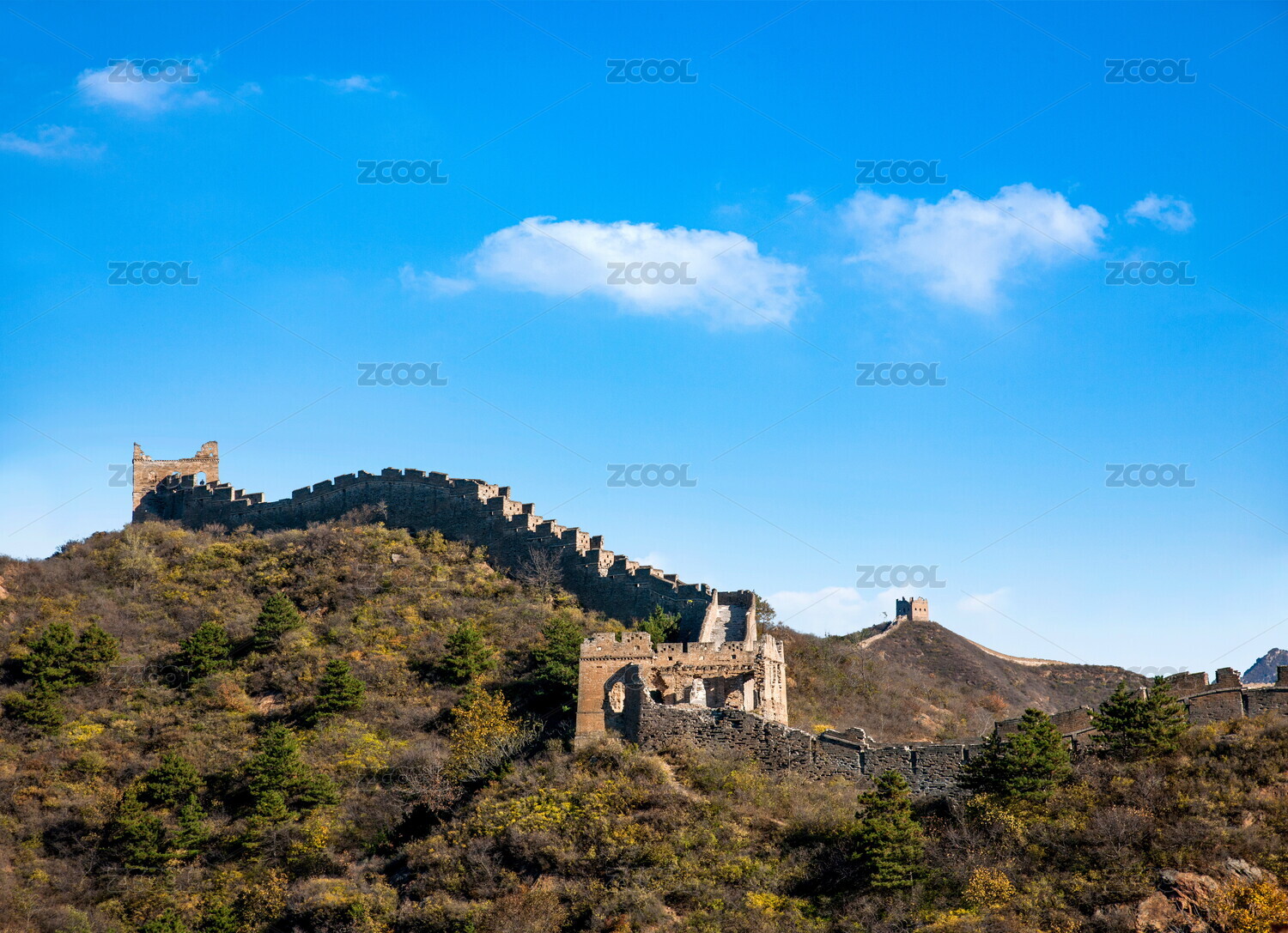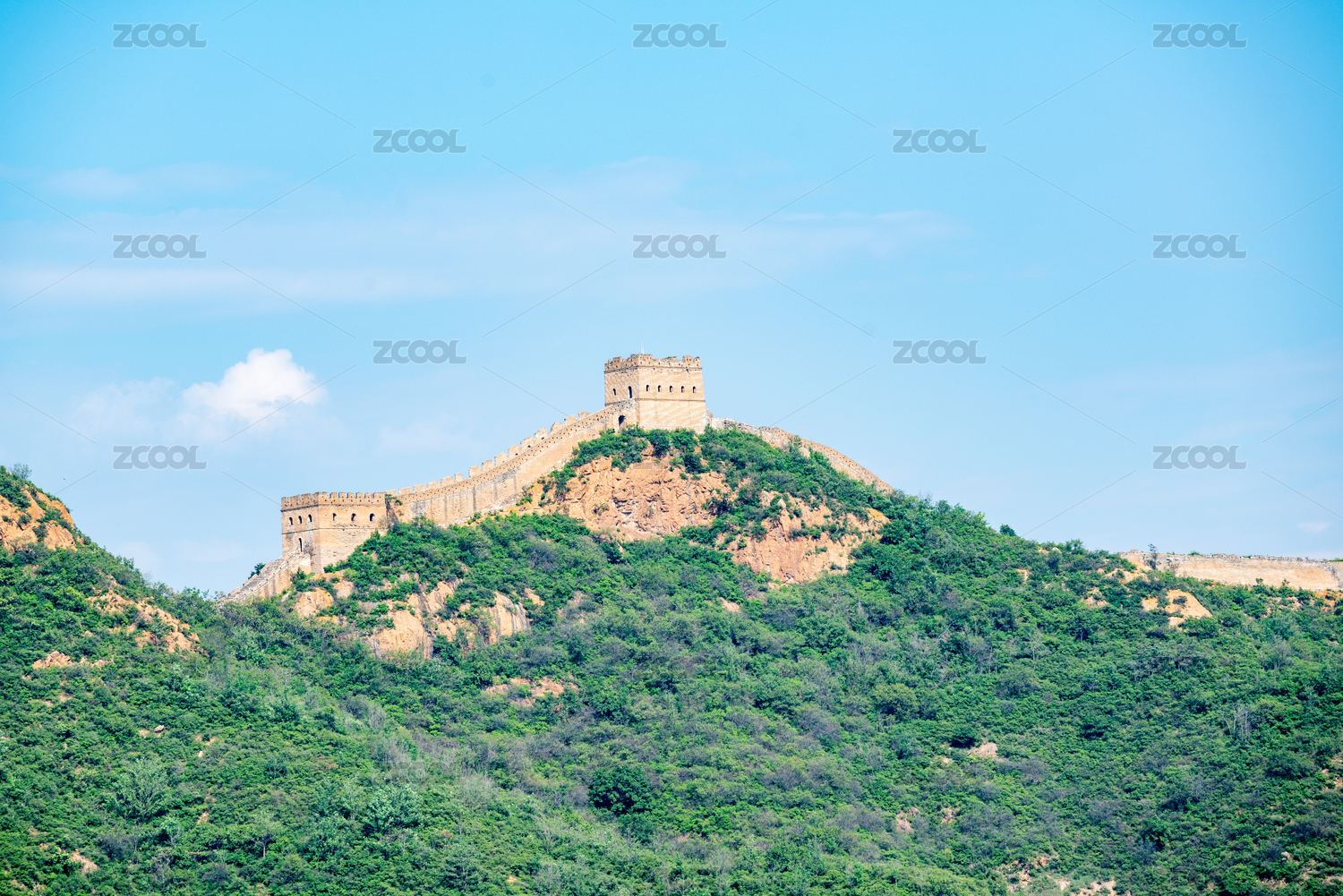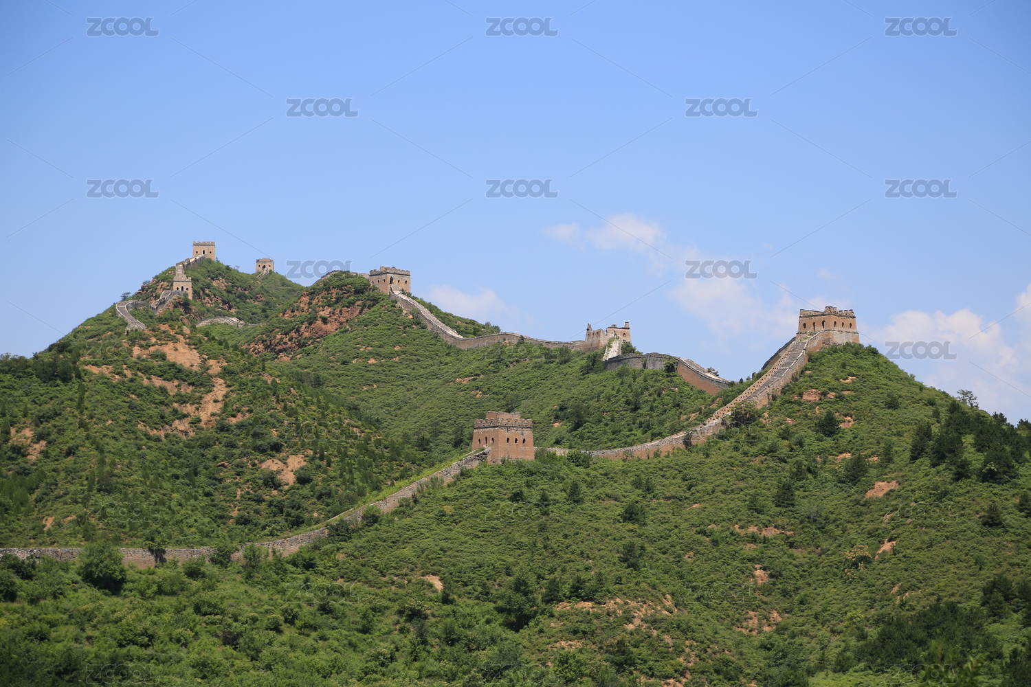 蓝天白云下的中国长城蜿蜒盘旋丛山峻岭