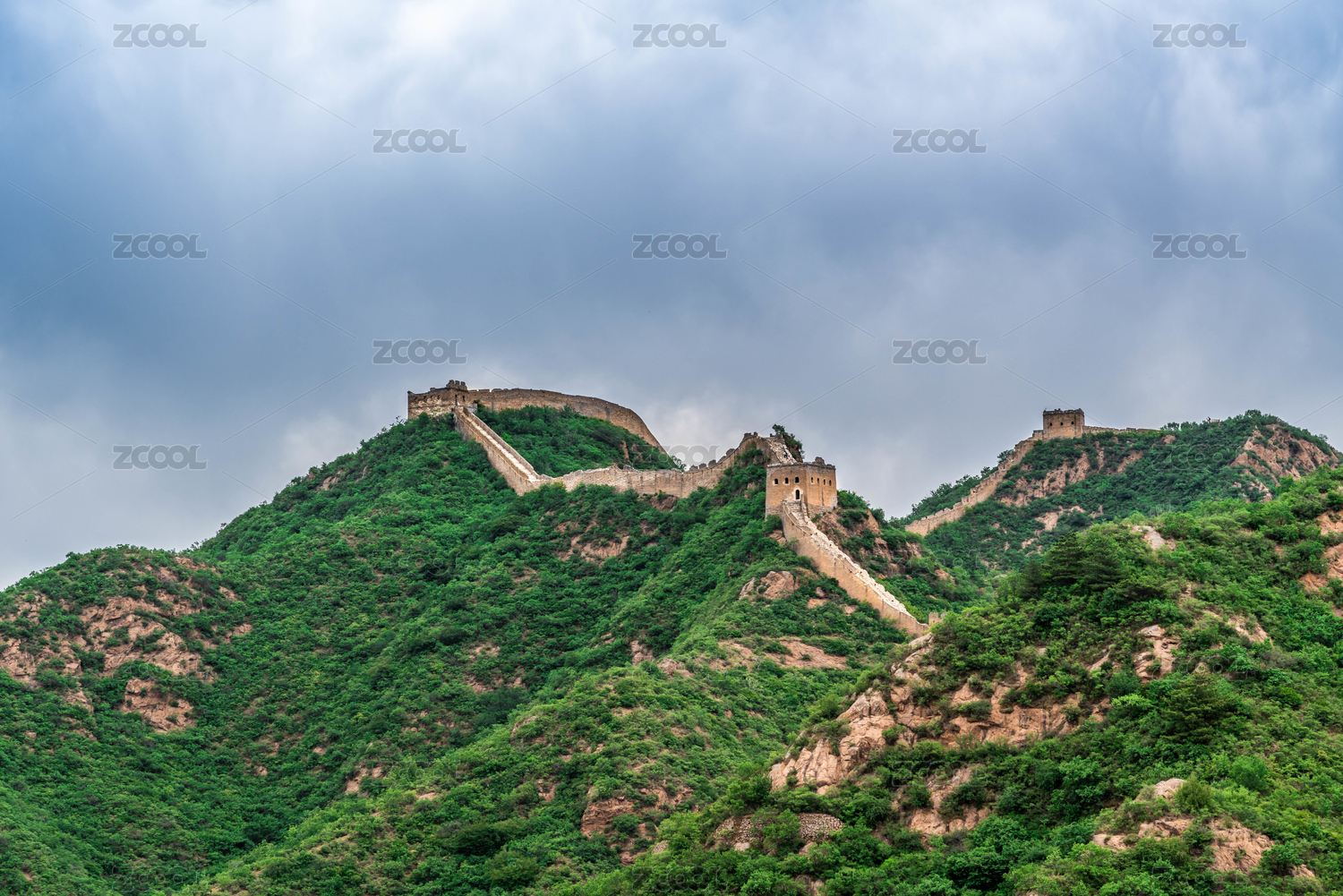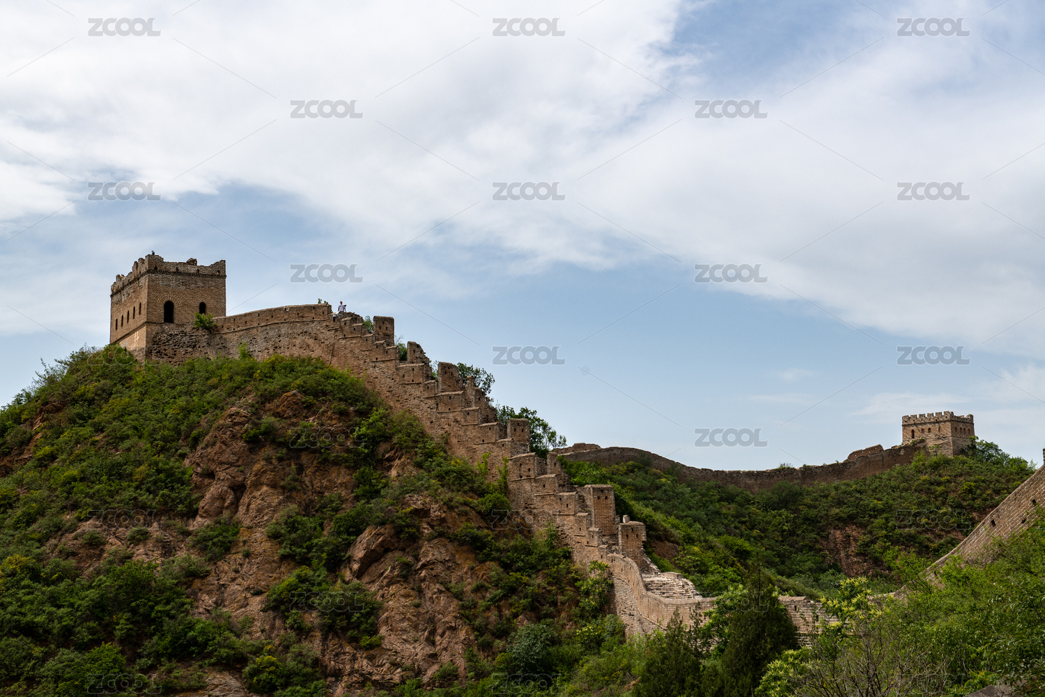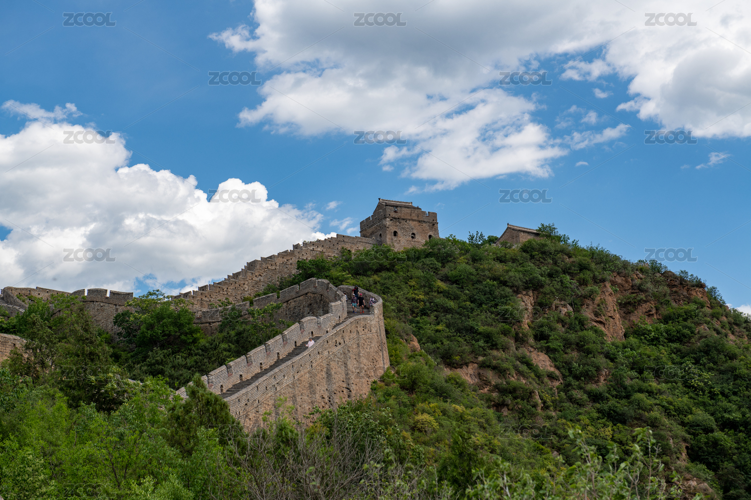 蓝天白云下的中国长城蜿蜒盘旋丛山峻岭