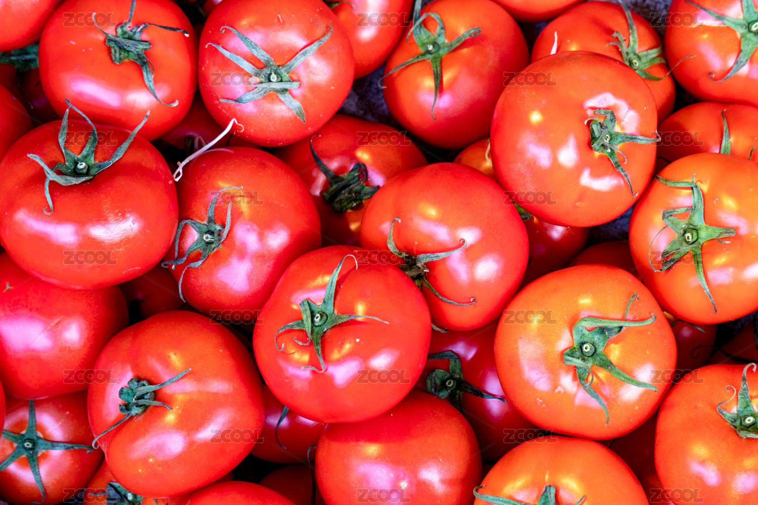 新鲜多汁的有机西红柿在农贸市场堆得很高