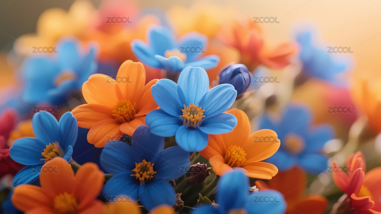 花瓶,花束,花朵,蓝色,橙色,绿色,桌子,光斑,背景,模糊