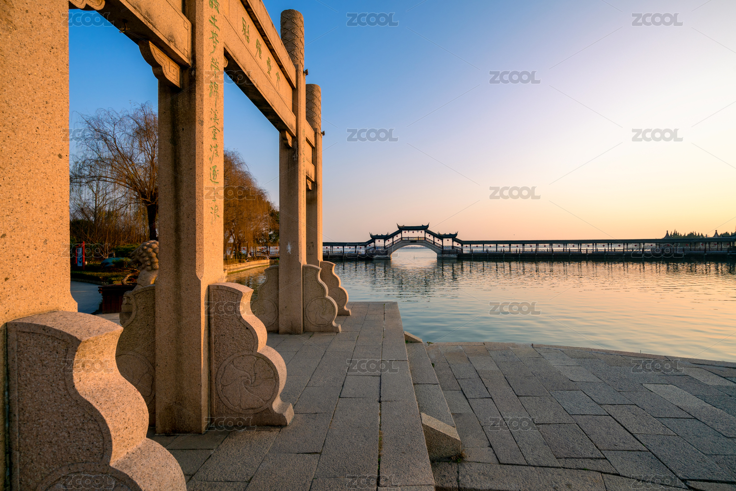 中国开封西湖岸边垂柳石栏风景