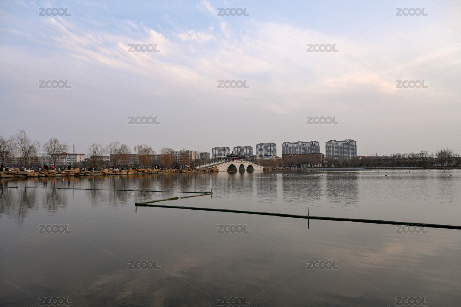 中国开封汴西湖冬天湖水岸边岩石东京大桥