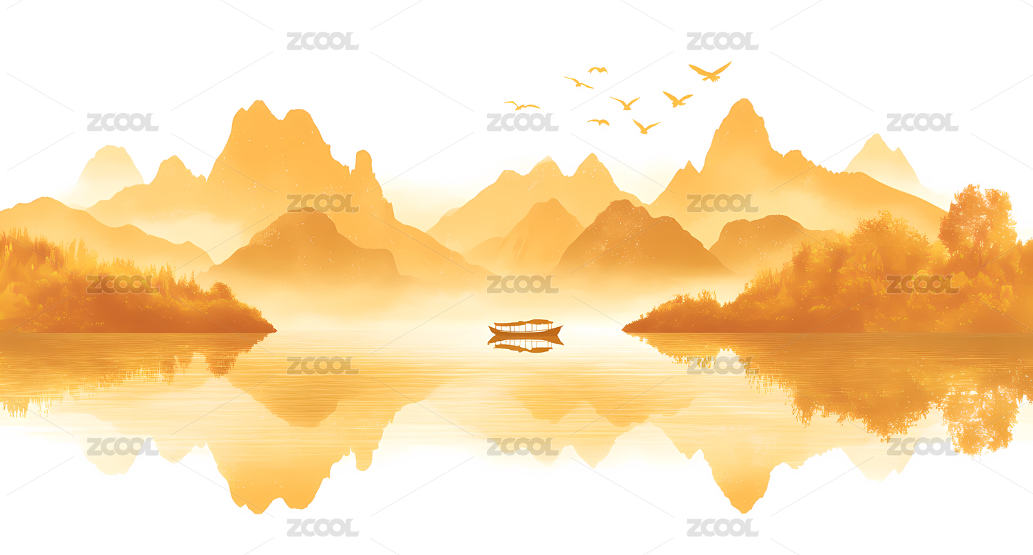 金色中式水墨山水风光画