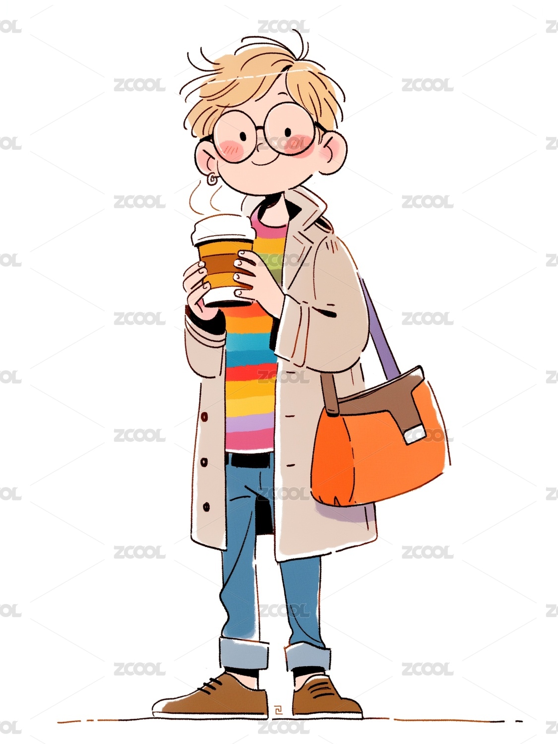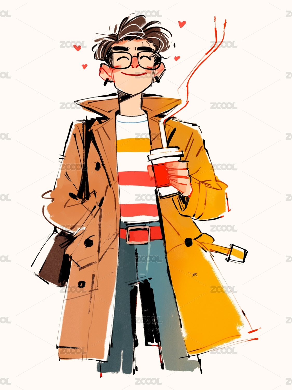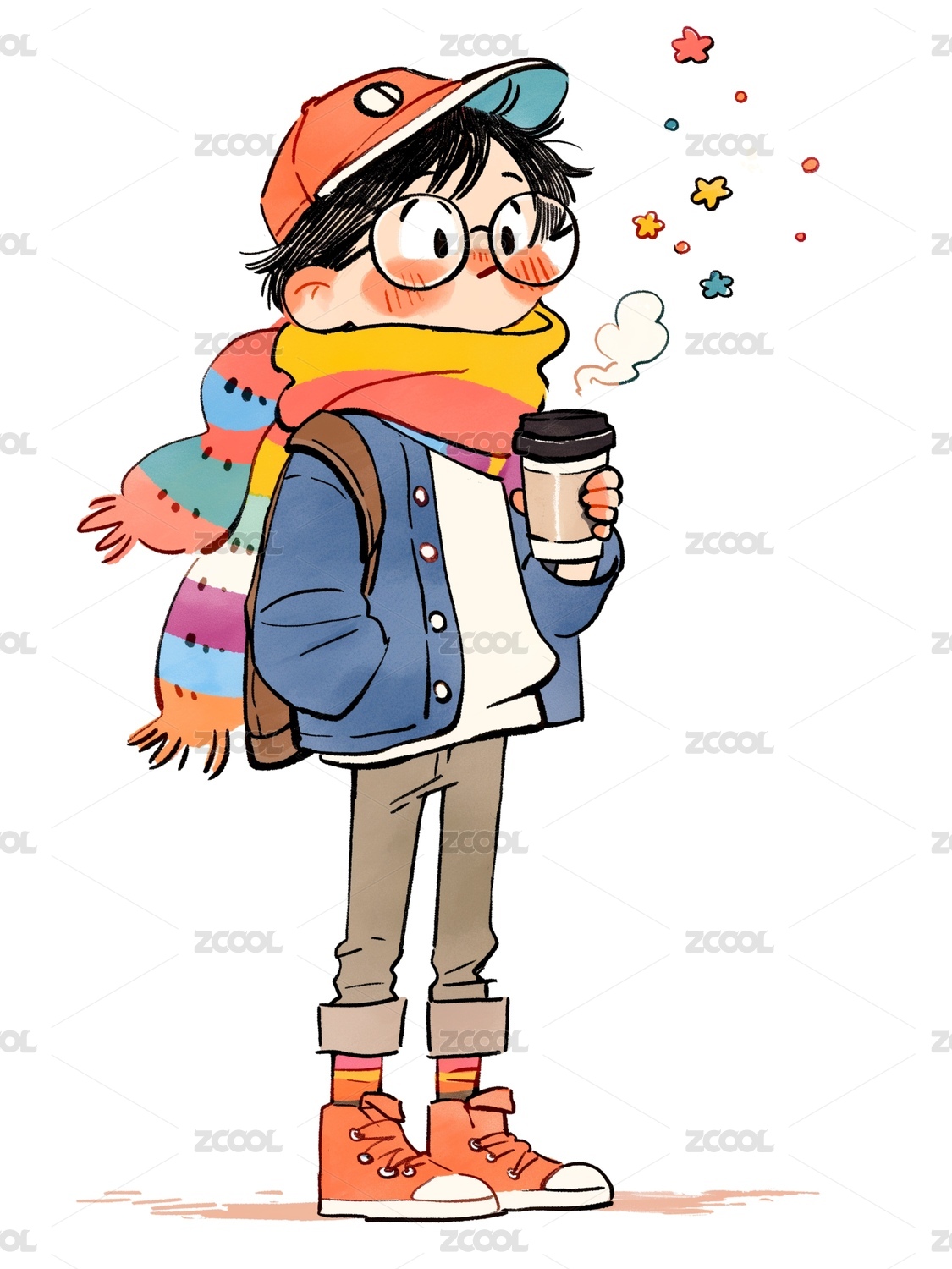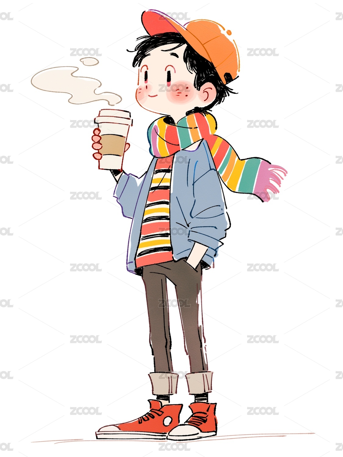 咖啡,男孩,插画,围巾,彩铅风,治愈系
