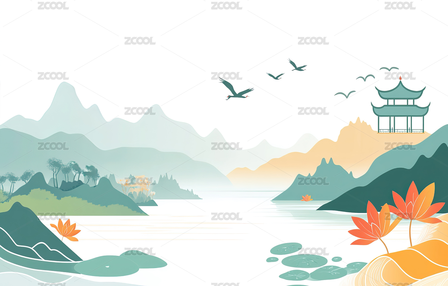 中式国潮唯美山水风景水墨风插画