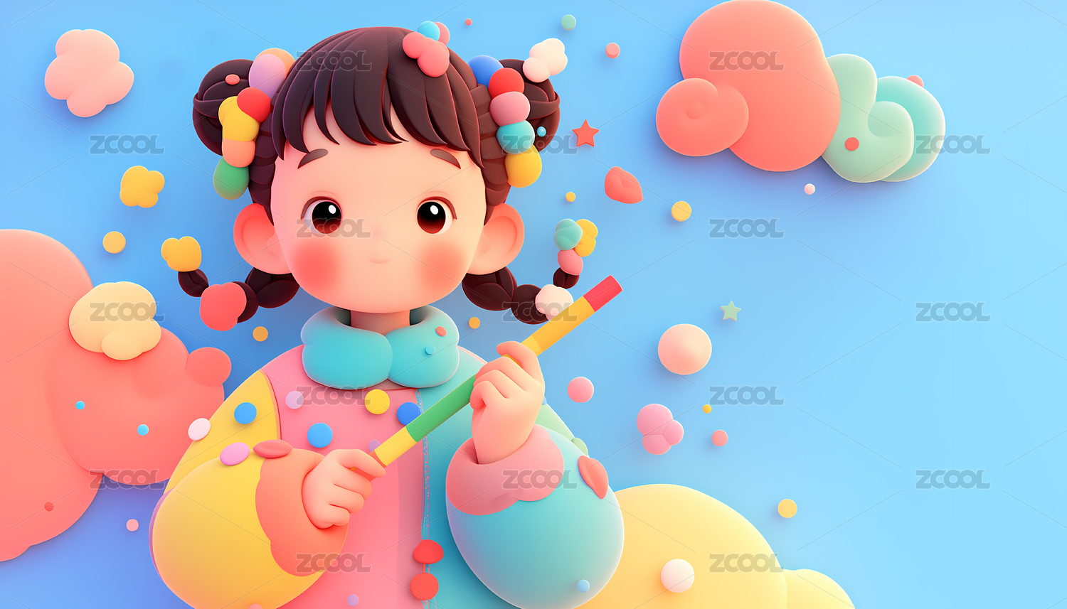 可爱女孩拿着彩笔五彩云朵儿童节3D插画