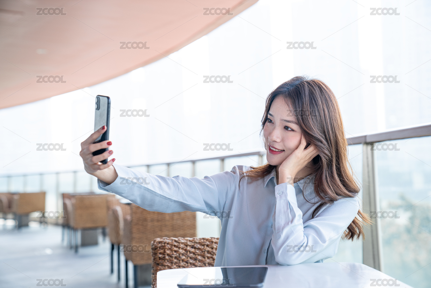 一个中国女抓住坐在休闲区用手机和别人沟通