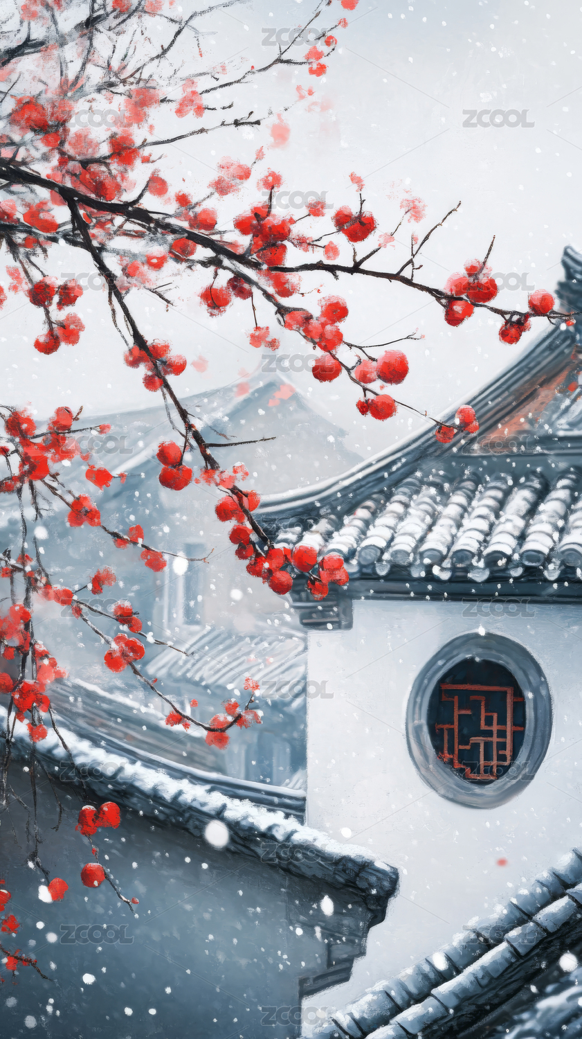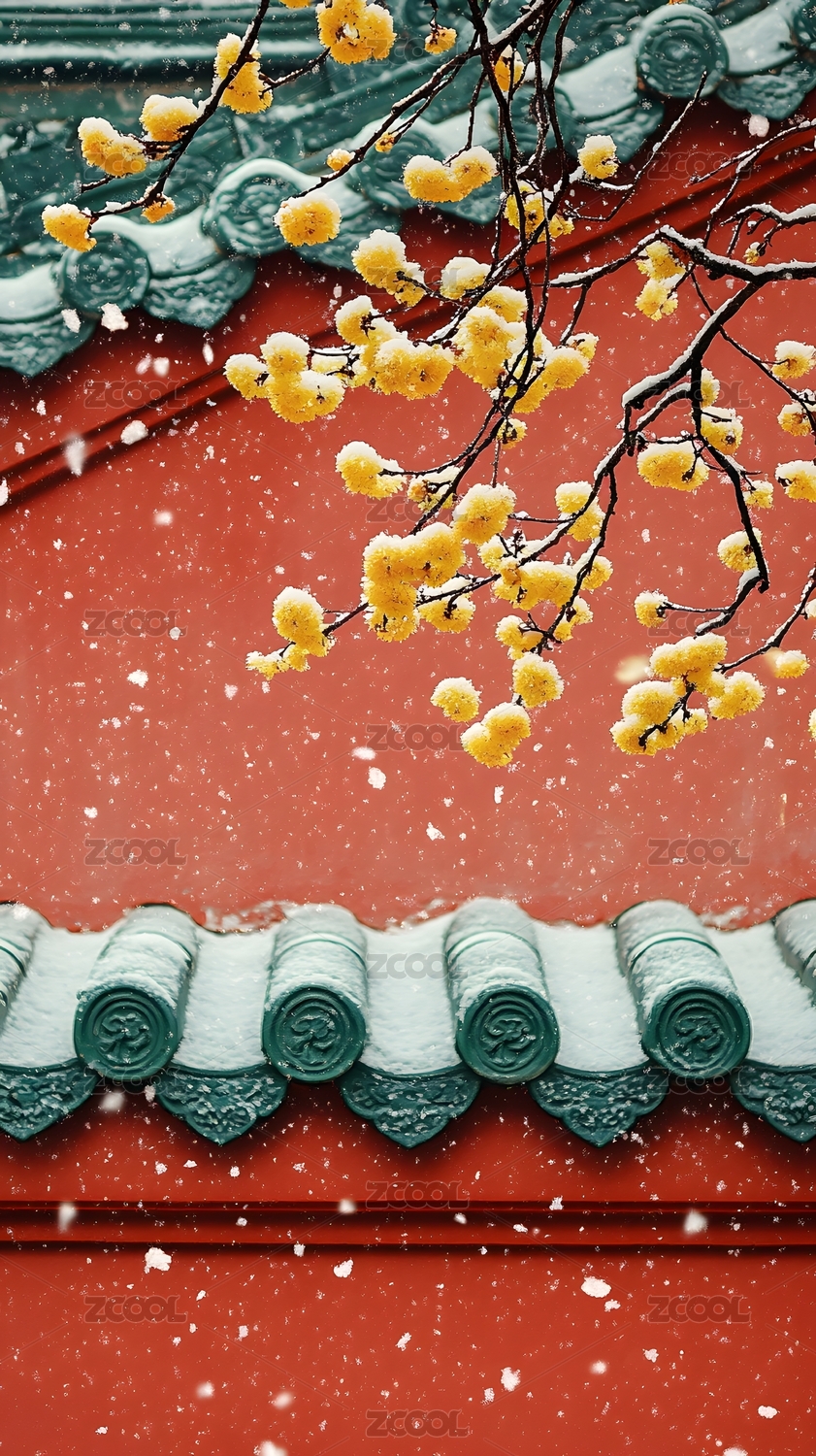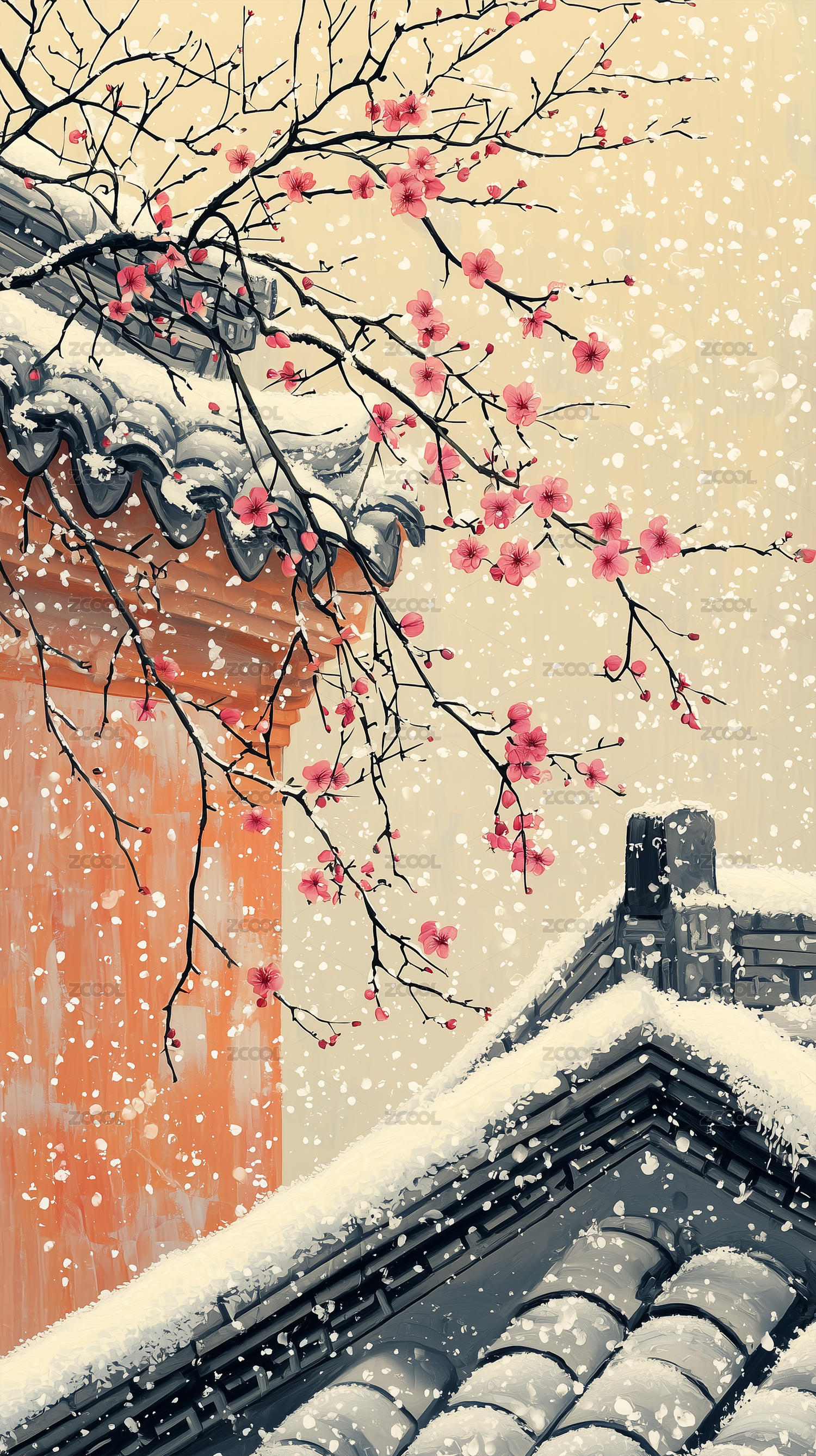 场景,国风,宫墙,宫,红墙,冬天,插画,红梅,立冬,梅花