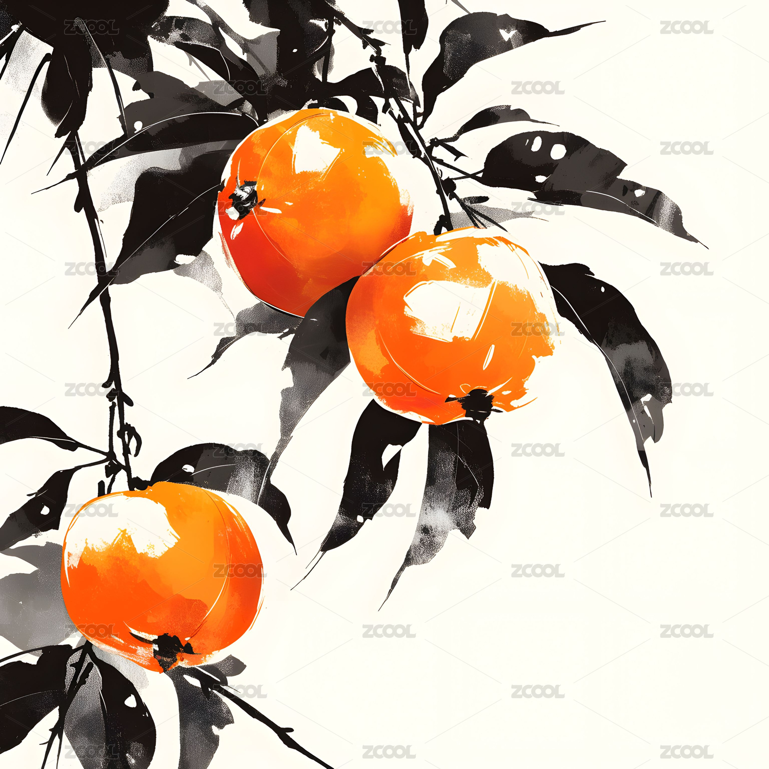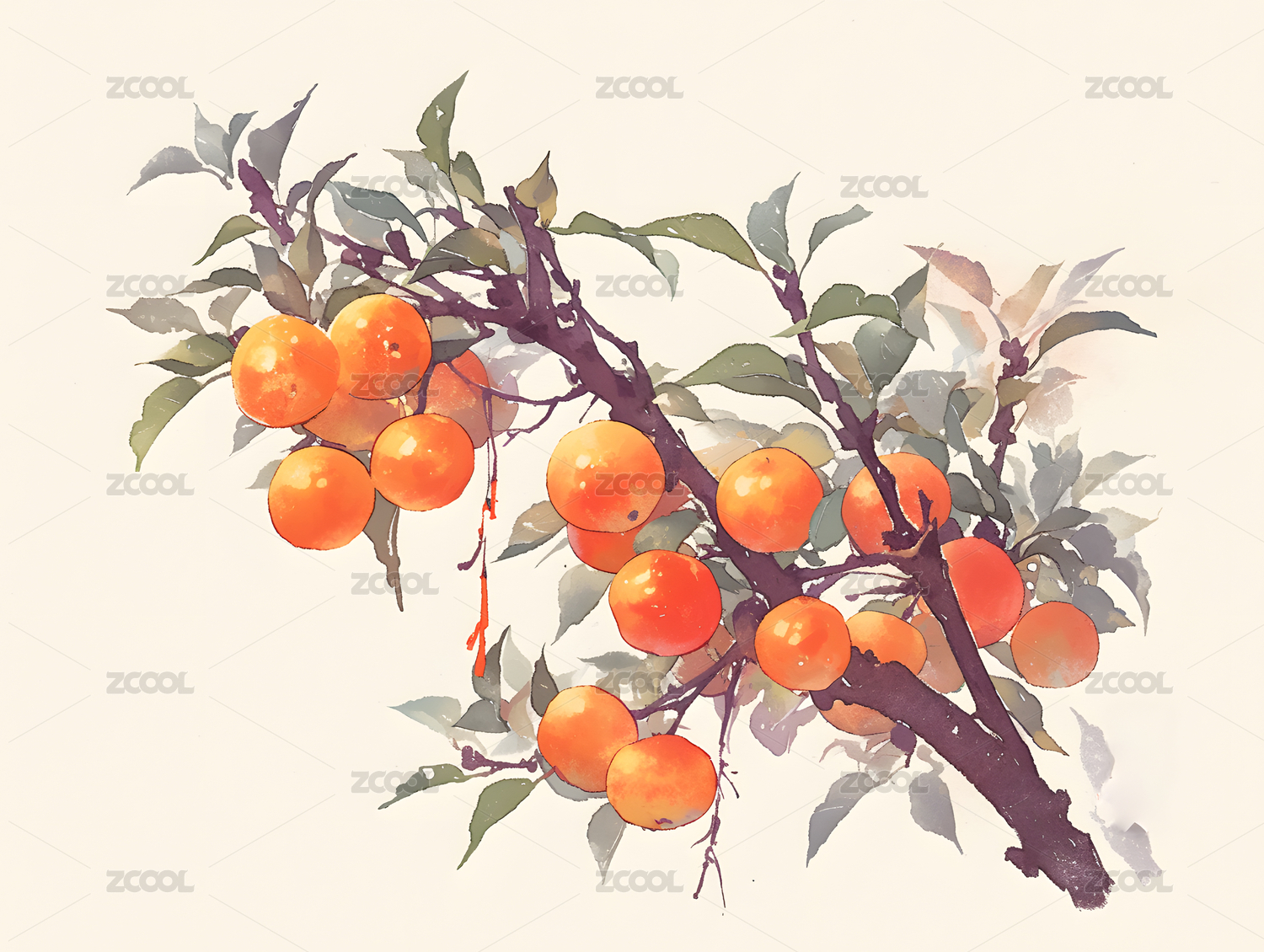 AIGC202402,秋天,水墨画,插画,食物,水果,树叶,叶子,树,果子