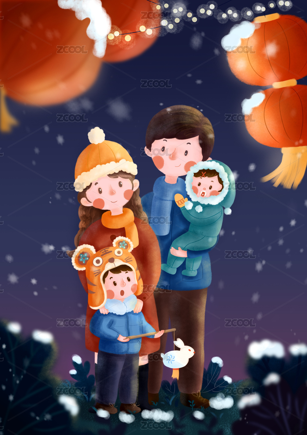 HEYYTGF2020,元宵,中秋,喜庆,温馨,温暖,家庭,亲子,插画,夜晚