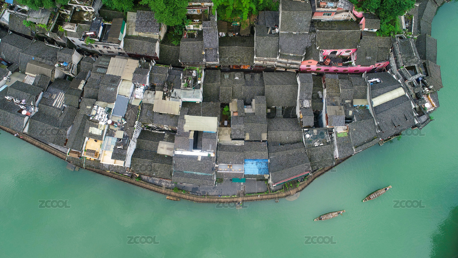 航拍中国湖南湘西凤凰古城沱江两岸吊脚楼建筑景观