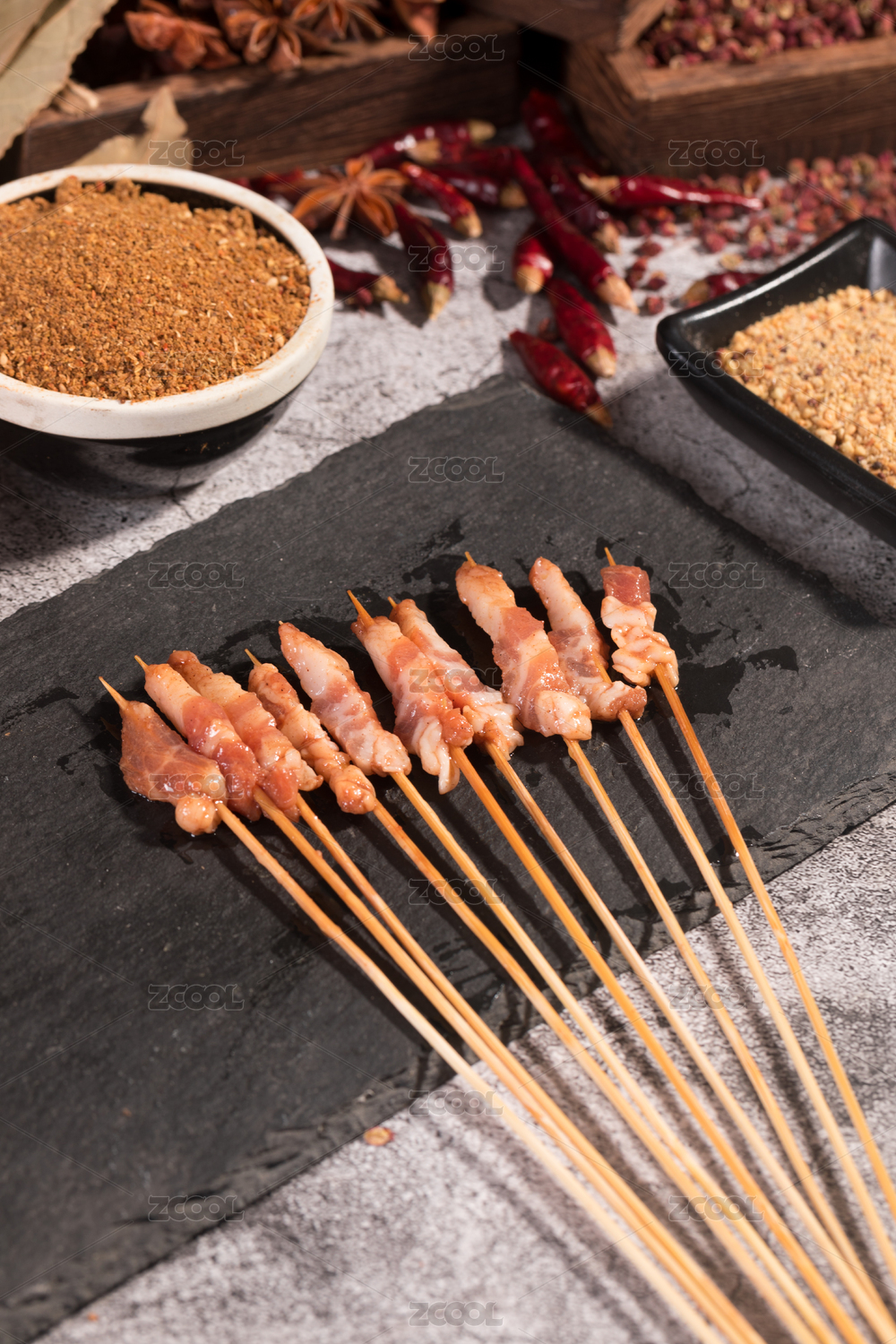 黑色石板上用竹签穿好的新鲜烤肉串串
