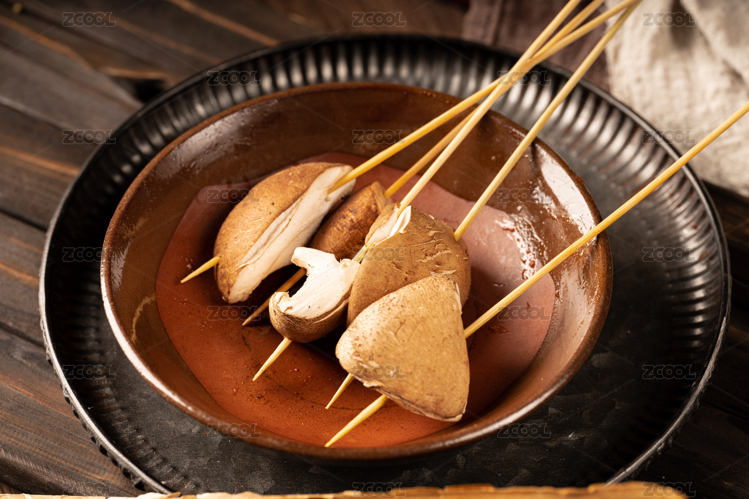 一份新鲜涮串食材鱼豆腐串放在竹帘上