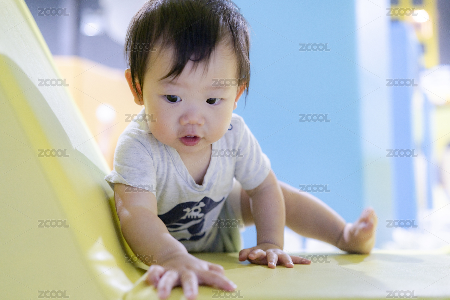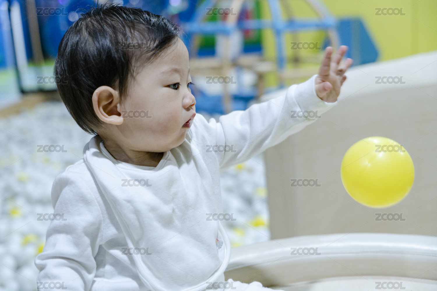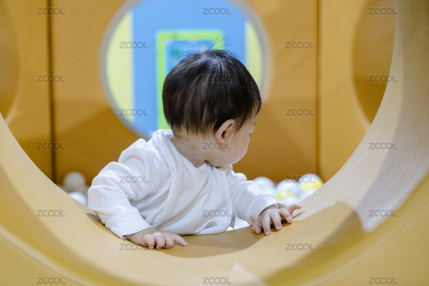 婴儿,海洋球堡,观察口,张望,观察,寻找,海洋球,许多,白色的,黄色的