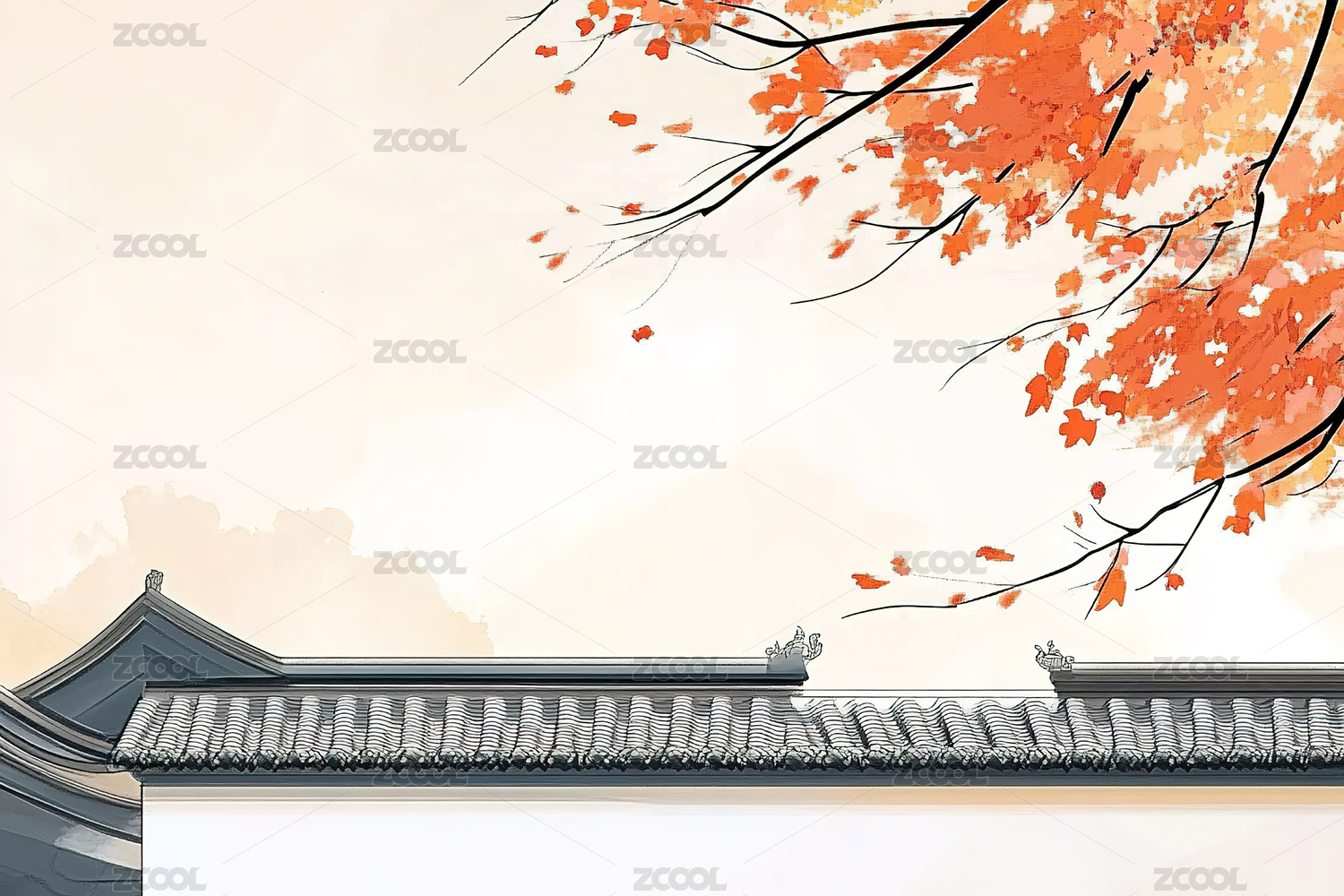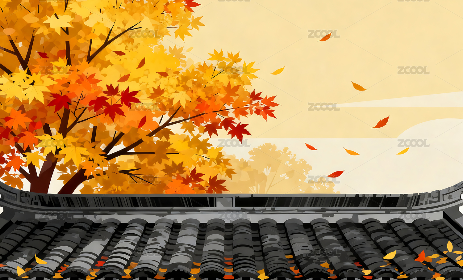 秋天屋顶树林插画背景壁纸