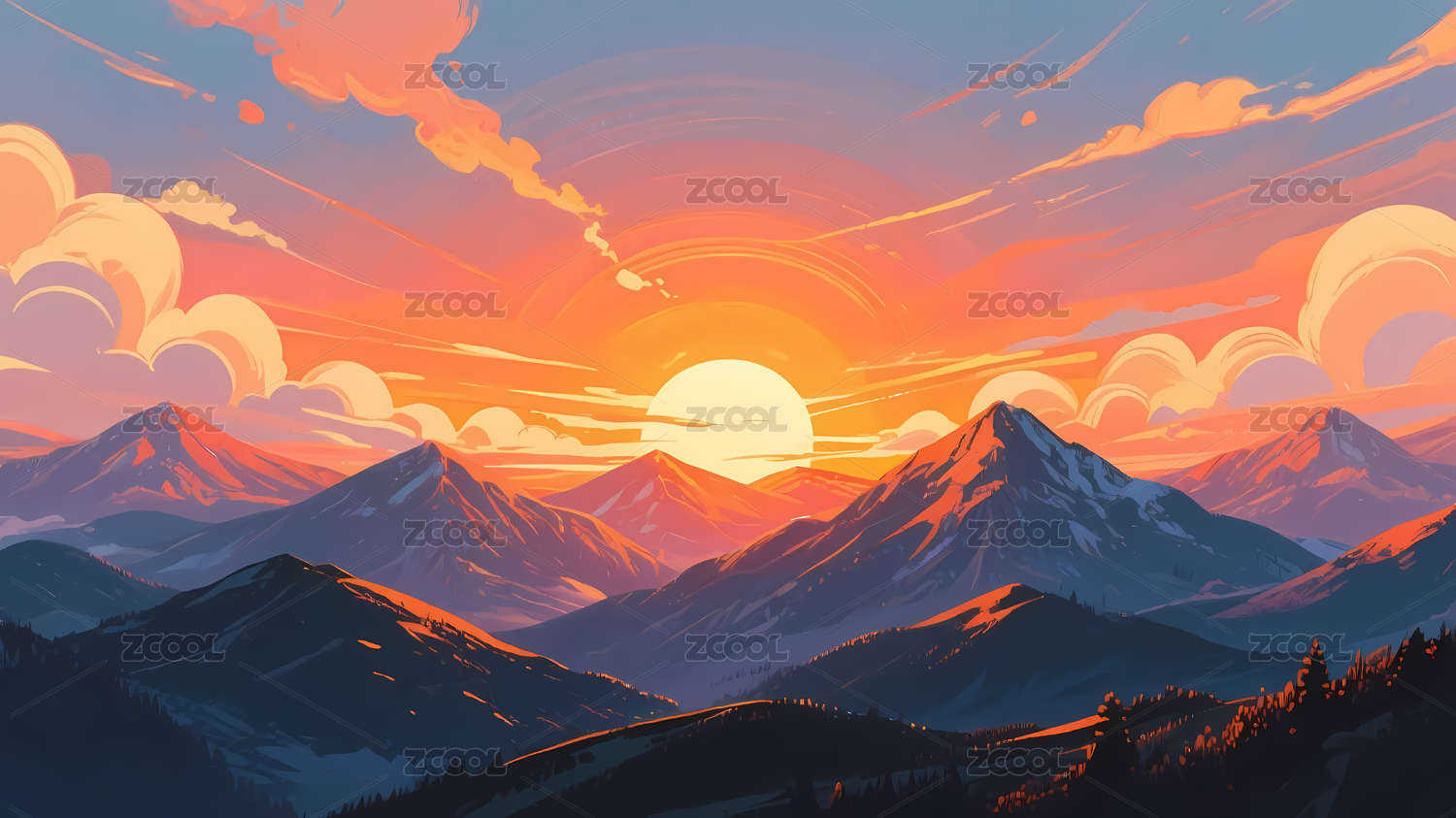 壮丽橙紫日落山脉