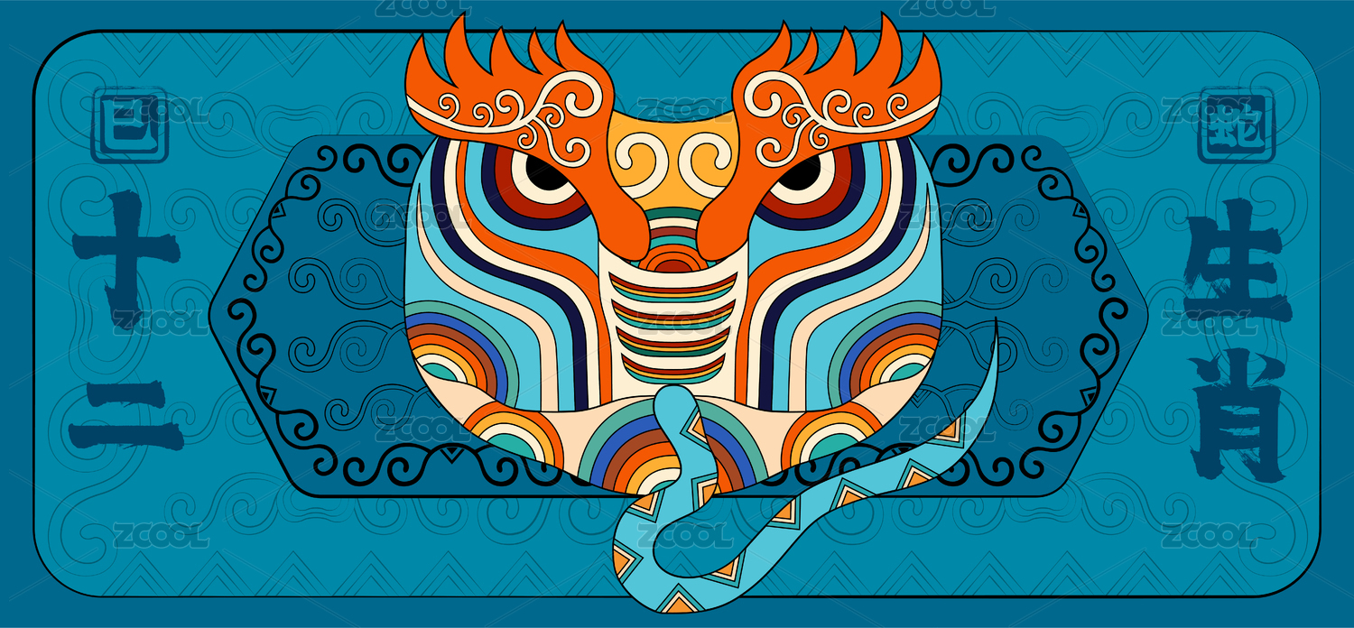 巳蛇国潮十二生肖时尚潮流印花纹样矢量插画