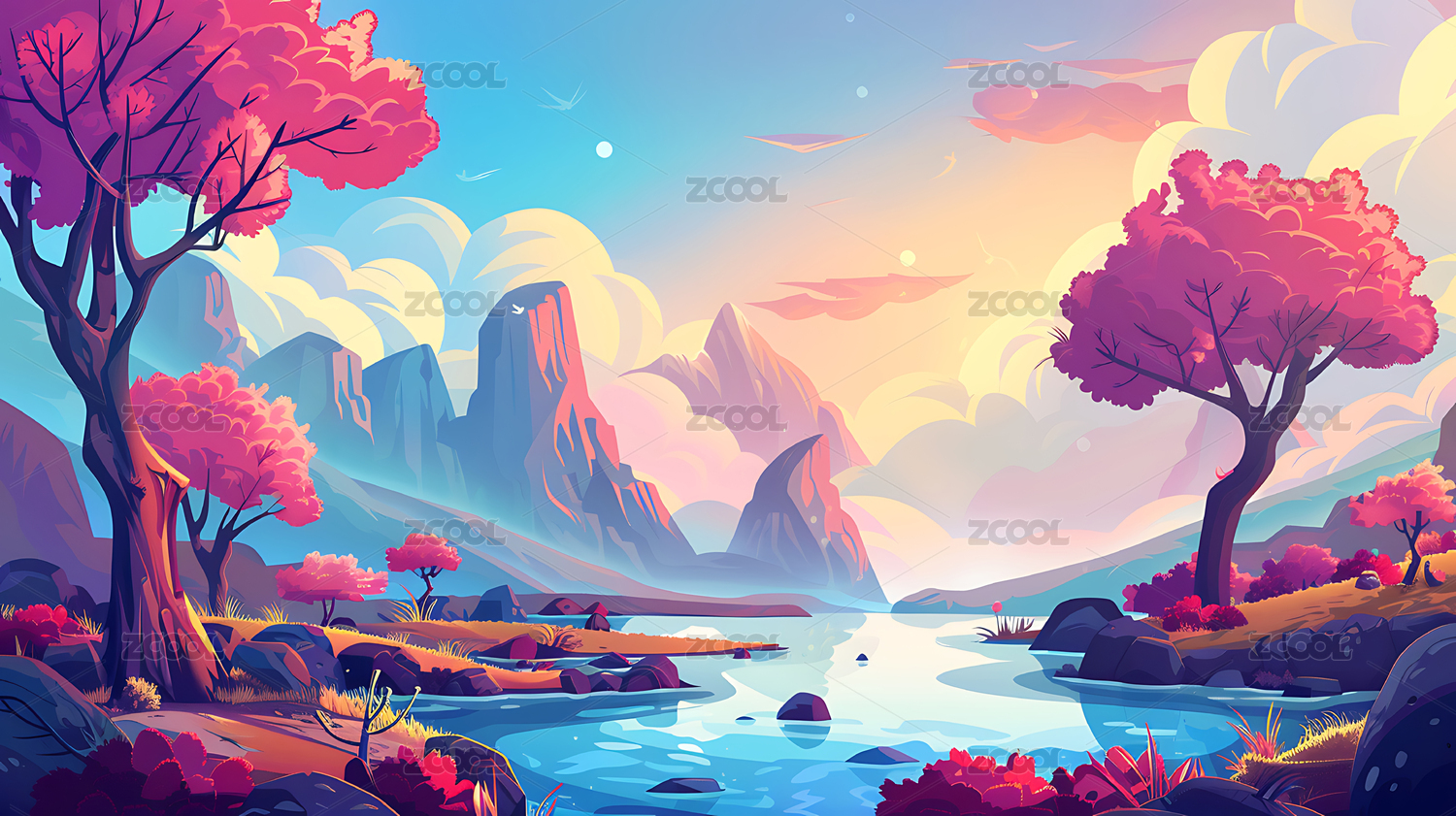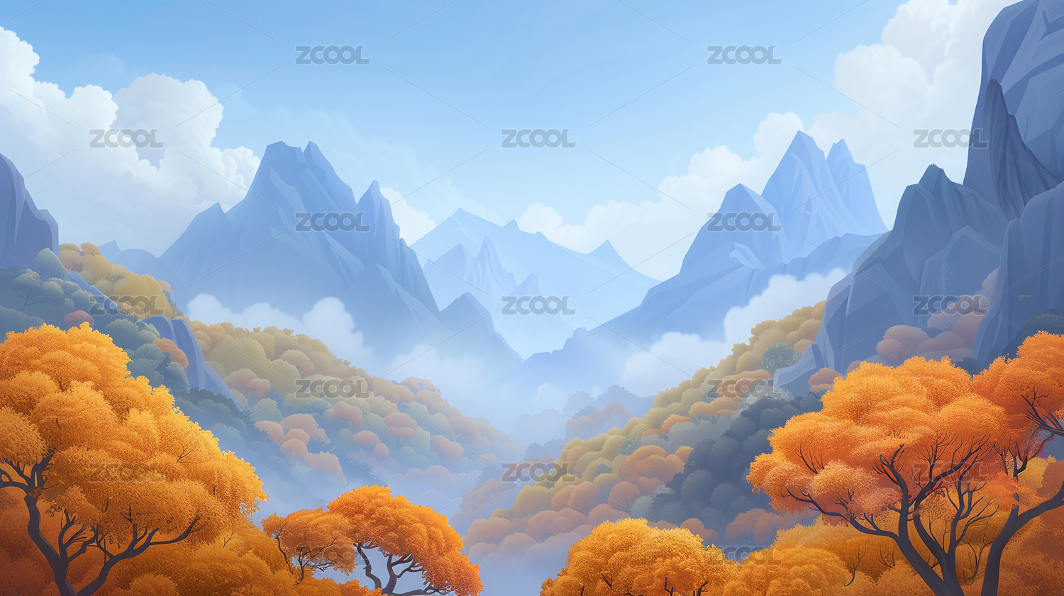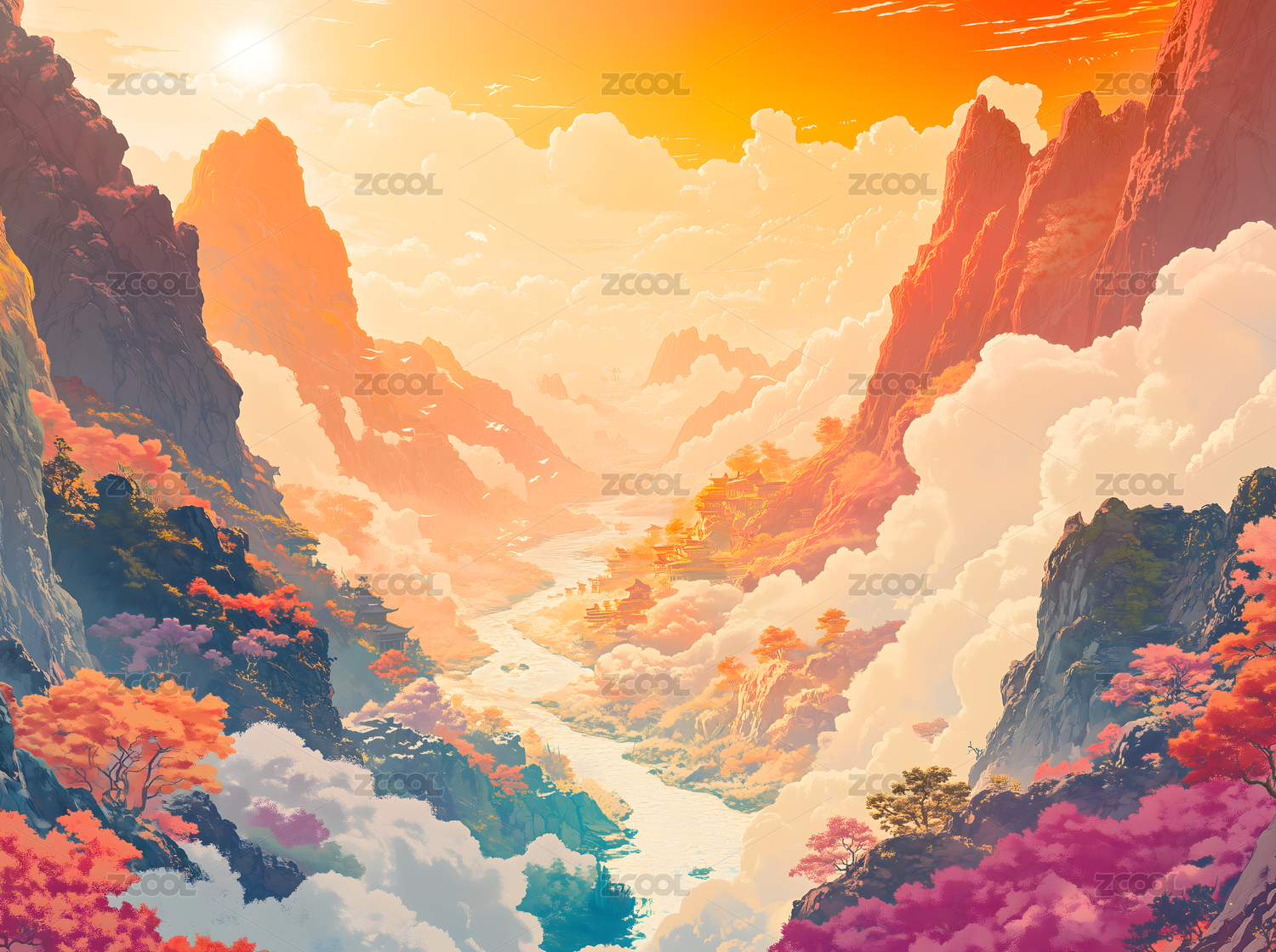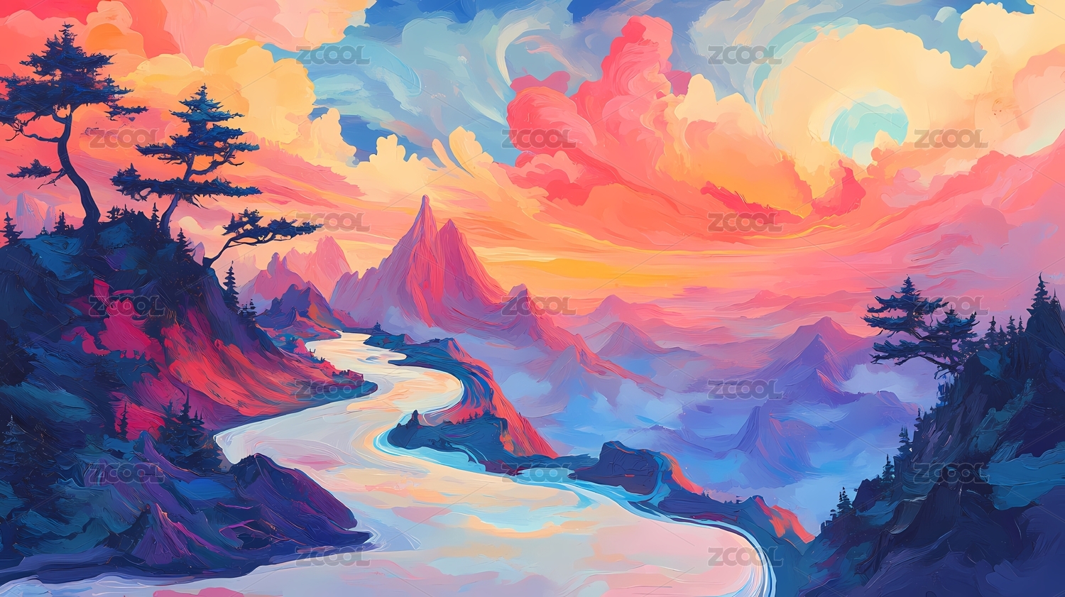 中国,山水,绘画,彩色,山,河流,树,山坡,云,插画