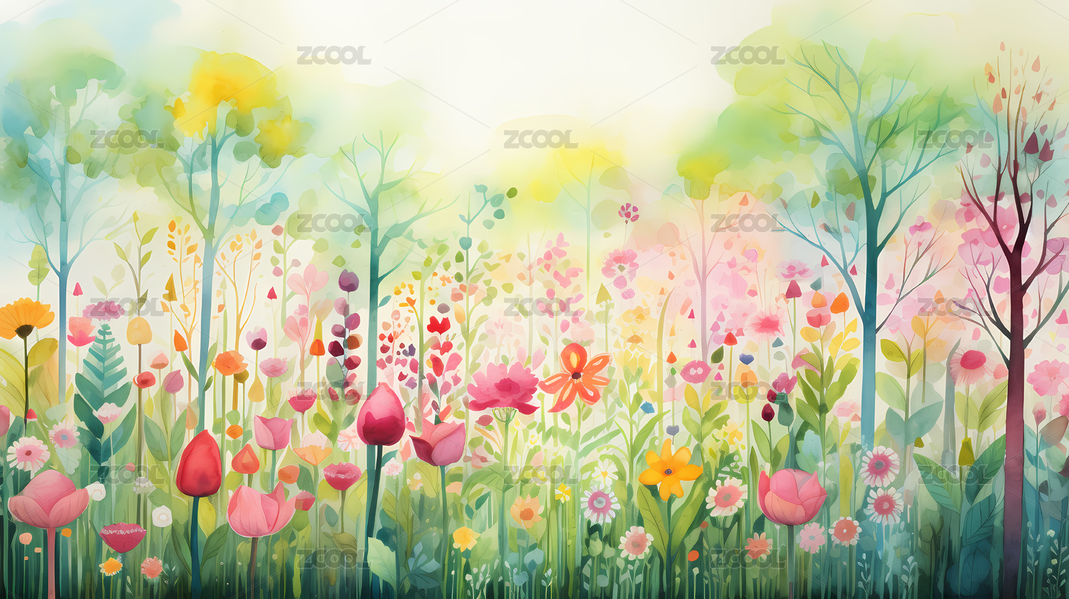 水彩草地花朵树木田插画背景海报装饰画背景