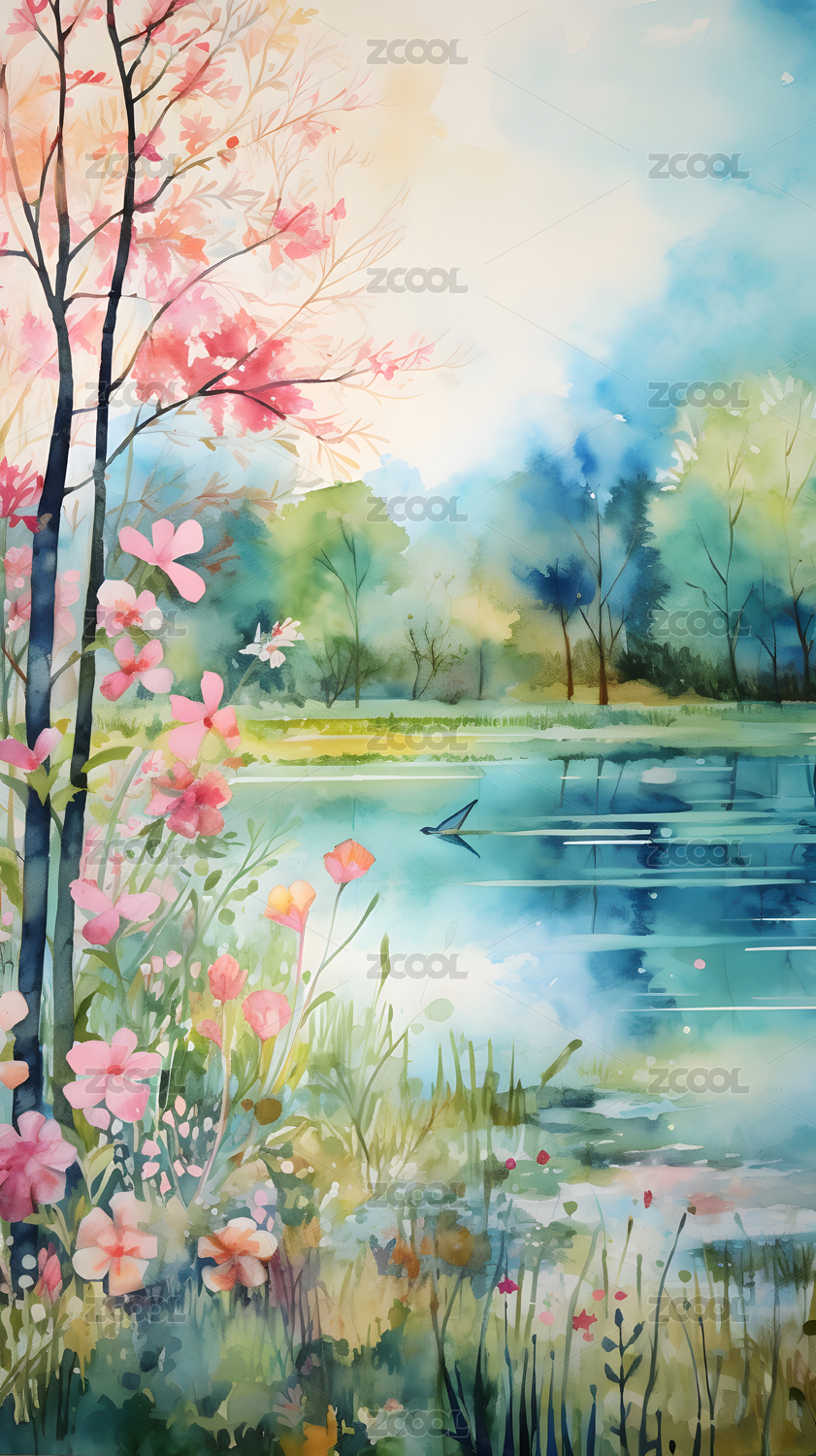 数码水彩湖泊花朵树木风景抽象海报背景