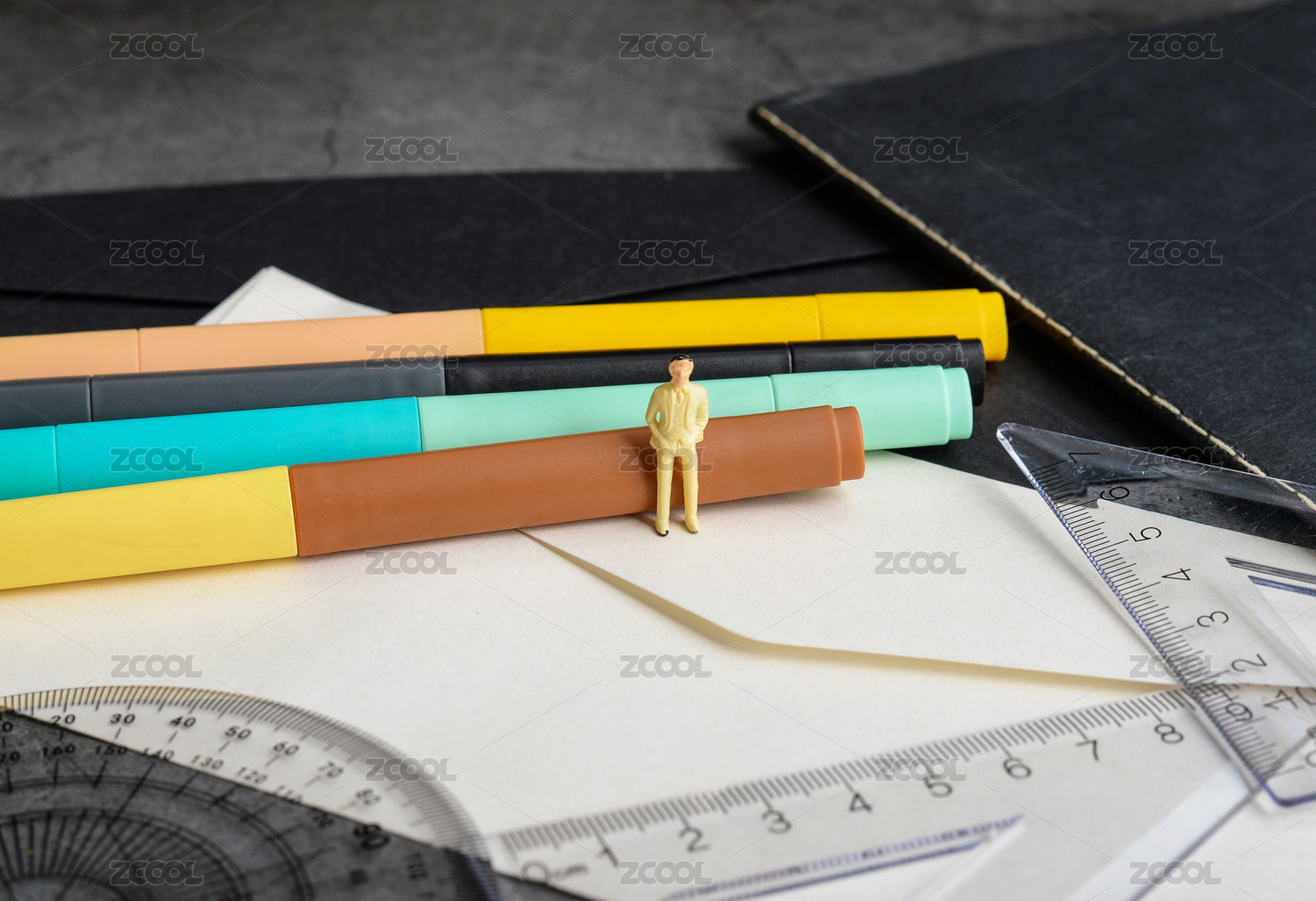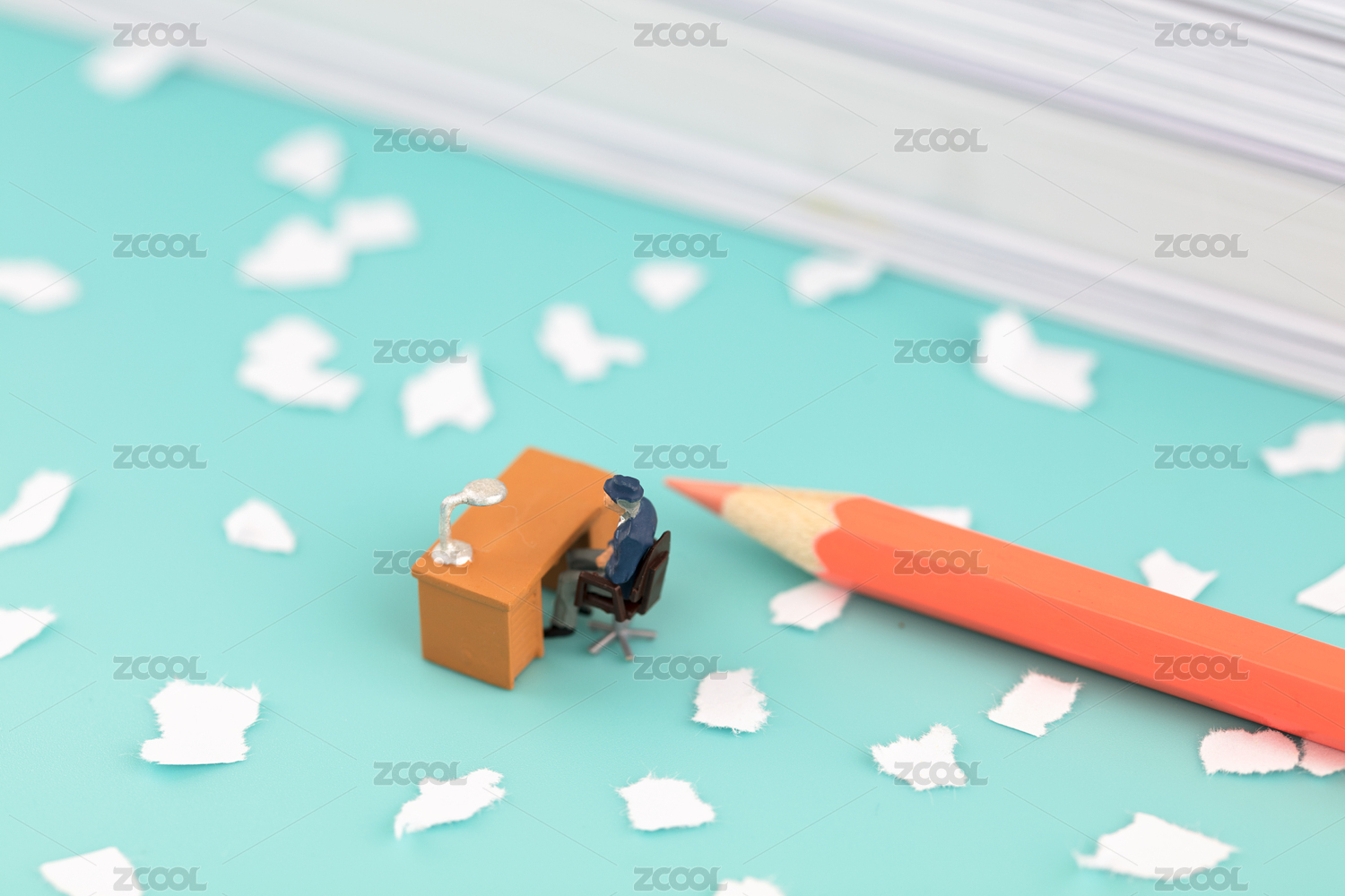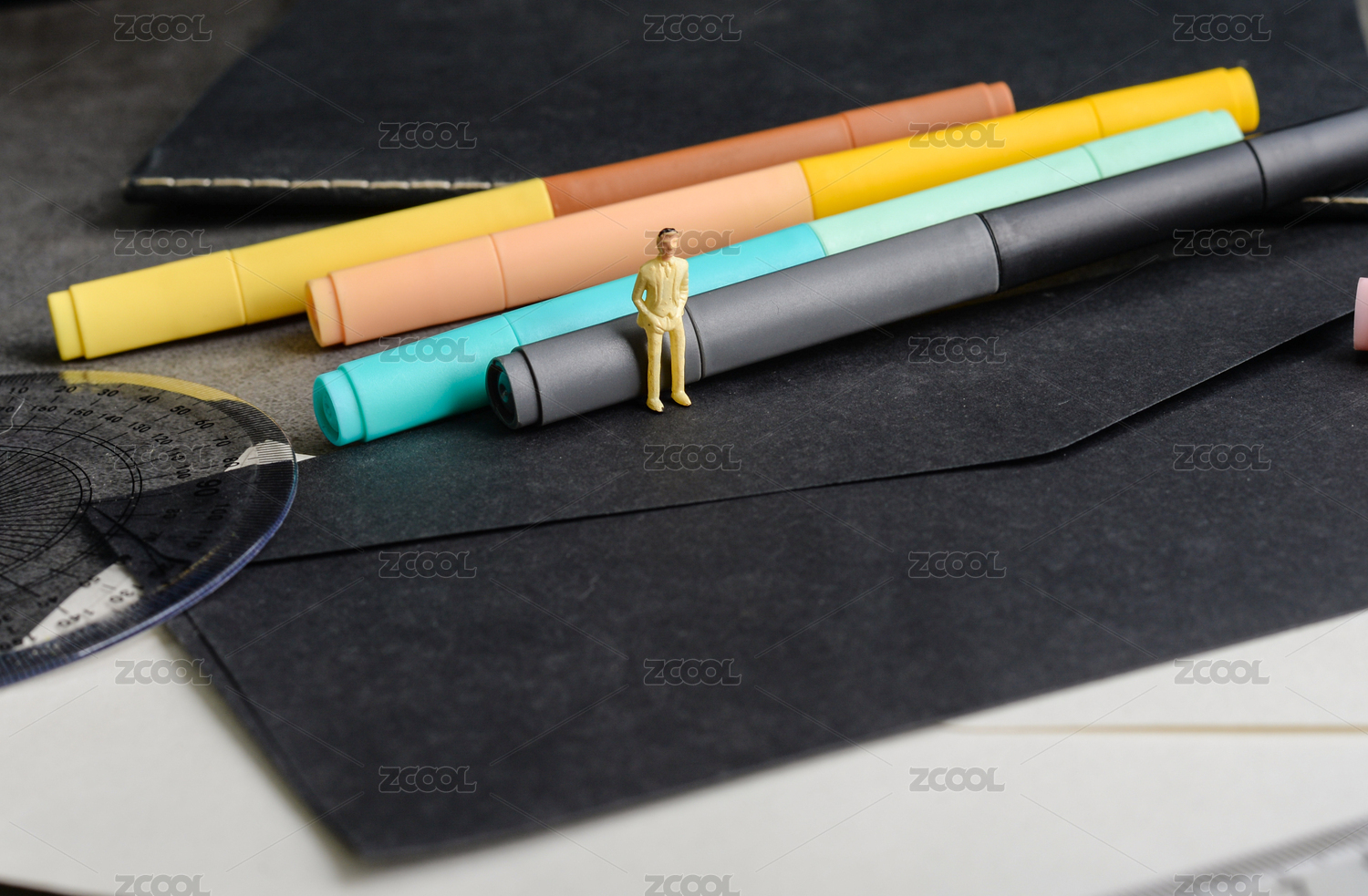 黑色铅笔周围黄色台灯下站着看报的人微缩创