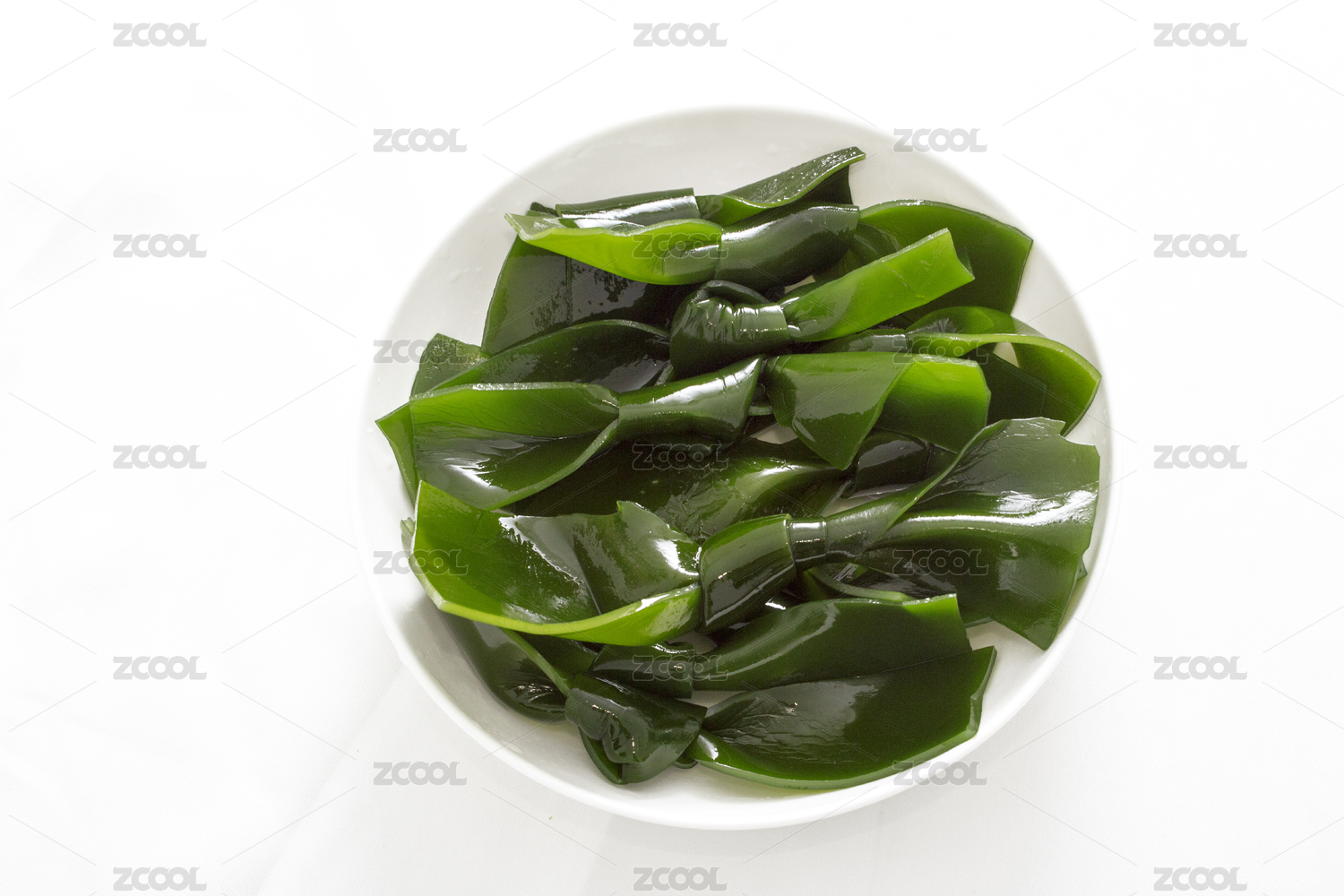 白色背景上餐具里摆放的海带结