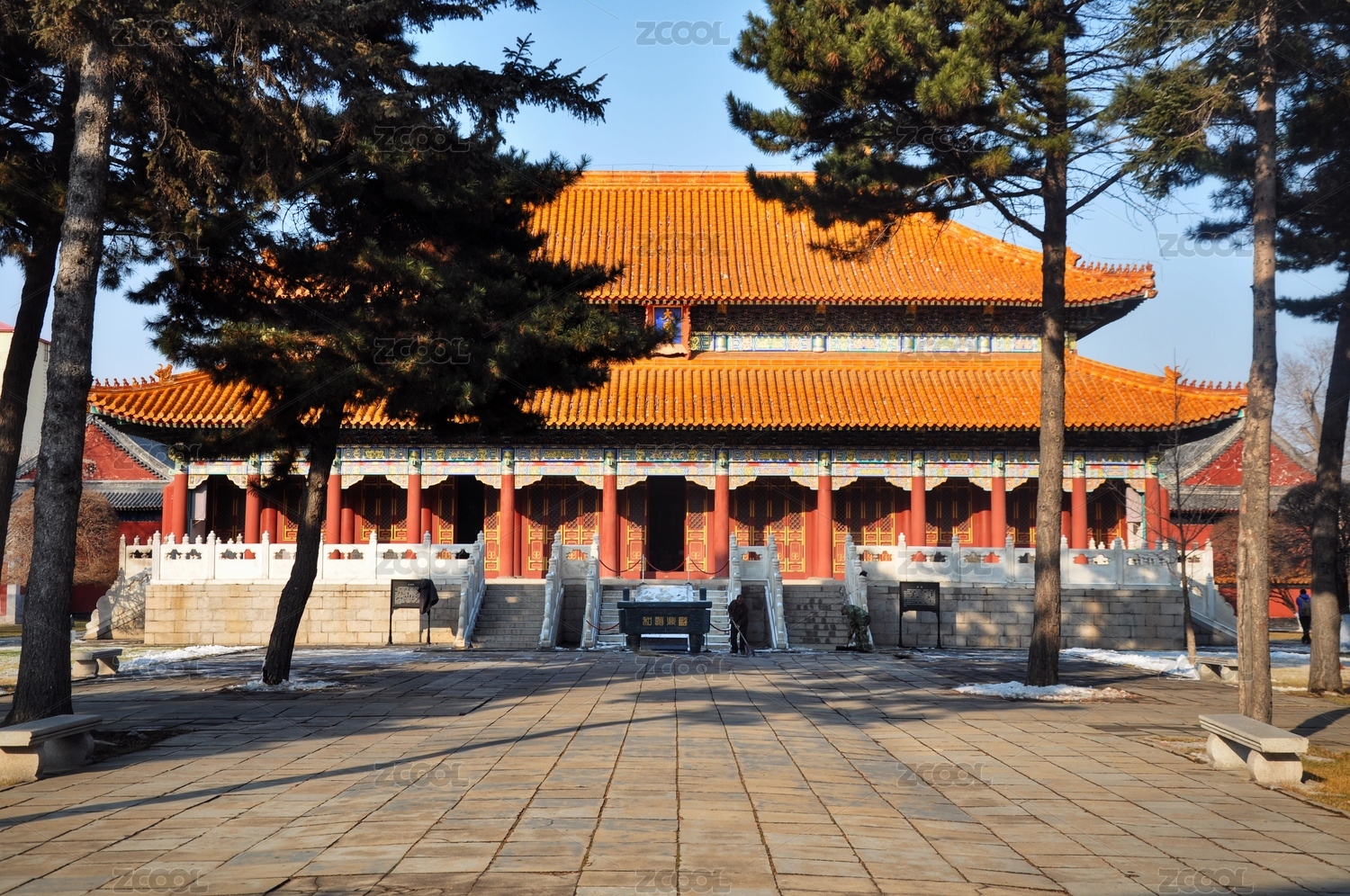 冬季雪后的中国辽宁沈阳清昭陵的正殿和广场