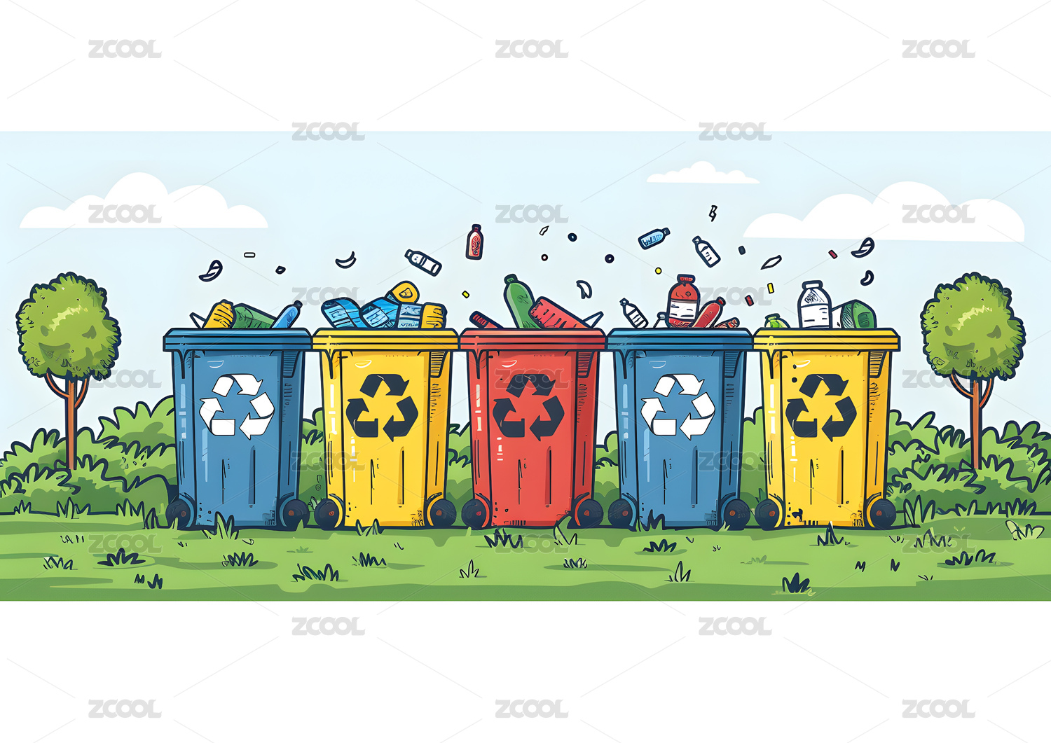 纯色背景的垃圾桶和垃圾分类主题创意插画