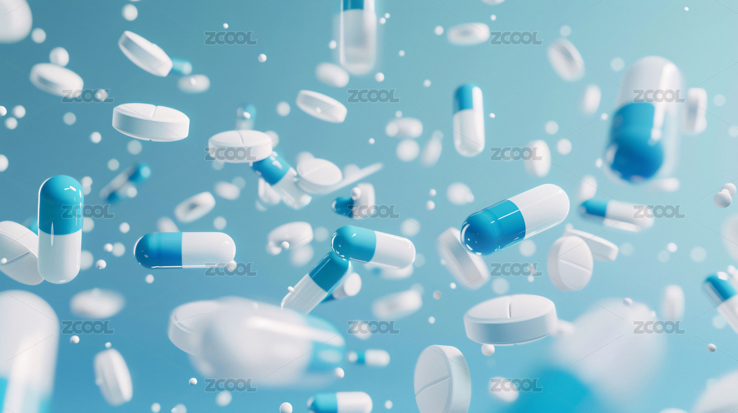 胶囊药片药品药瓶漂浮展示,三维简约背景