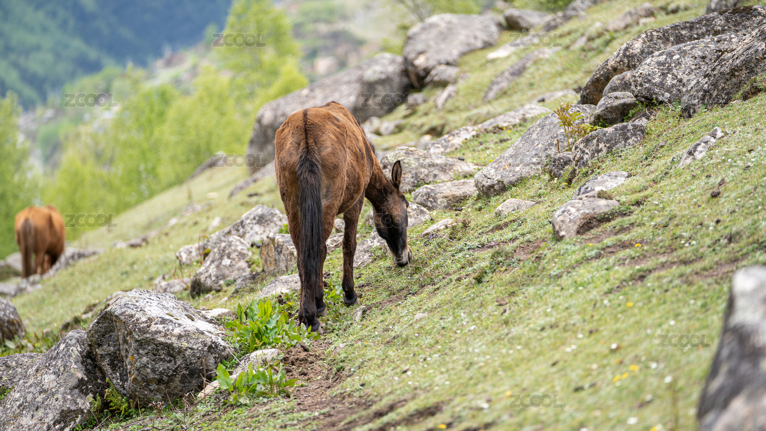 四川阿坝,海子沟,吃草,马匹,马,野外,动物,放养,牲畜,地形