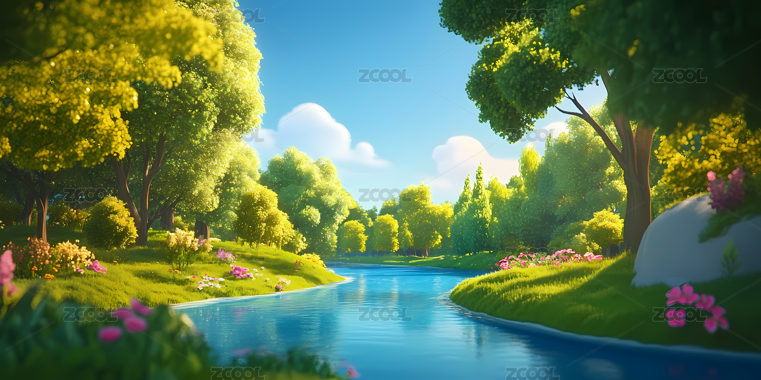 田园,小屋,丘陵,绿地,春天,宁静,清新,自然,风景,卡通