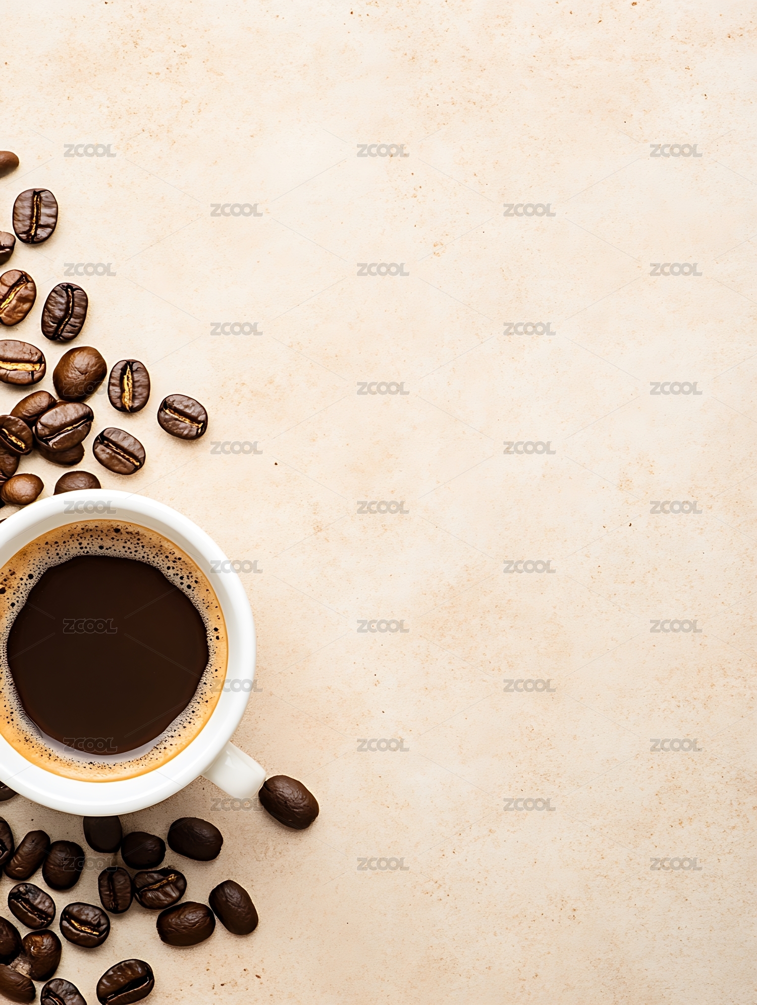 水泥裂纹墙前的一杯咖啡与咖啡豆