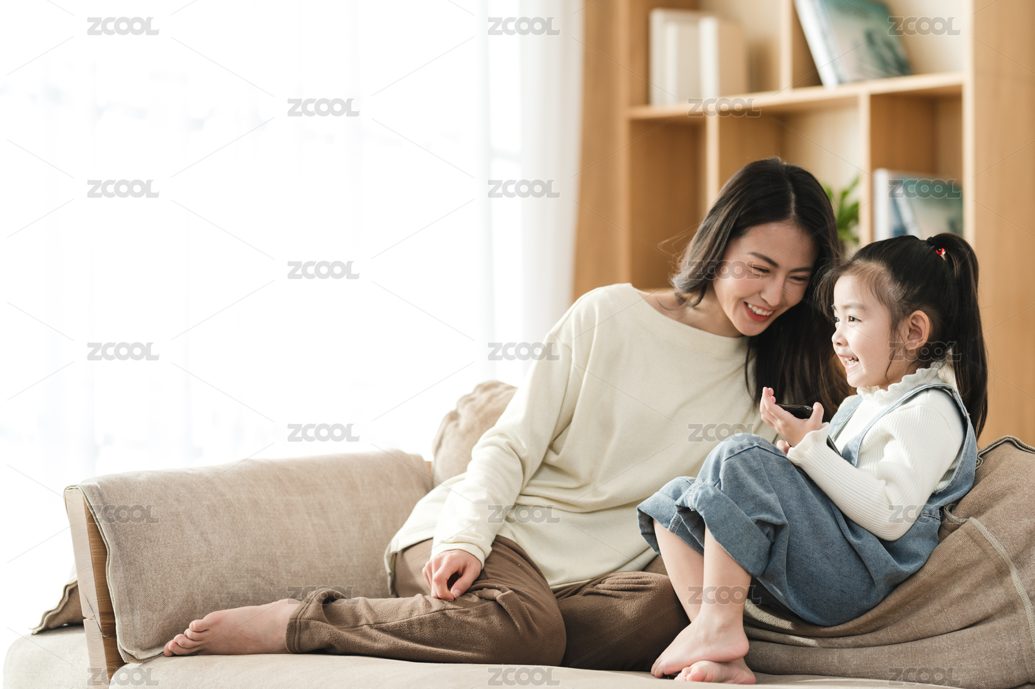 可爱的亚洲中国女儿拿着遥控器挑选喜爱的频道与她的母亲指着电视屏幕坐在客厅的沙发上。