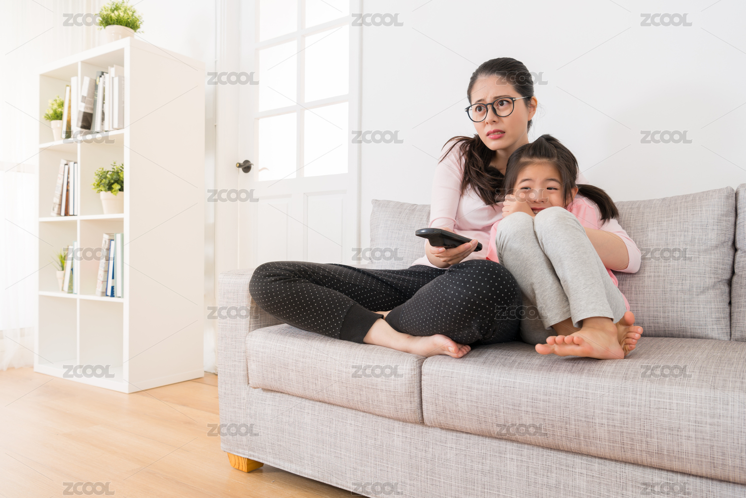 亚洲妈妈和女儿看电影与家用电视看电影很棒的感觉害怕坐在沙发上沙发在客厅展示在阳光明媚的假日紧张的表情。