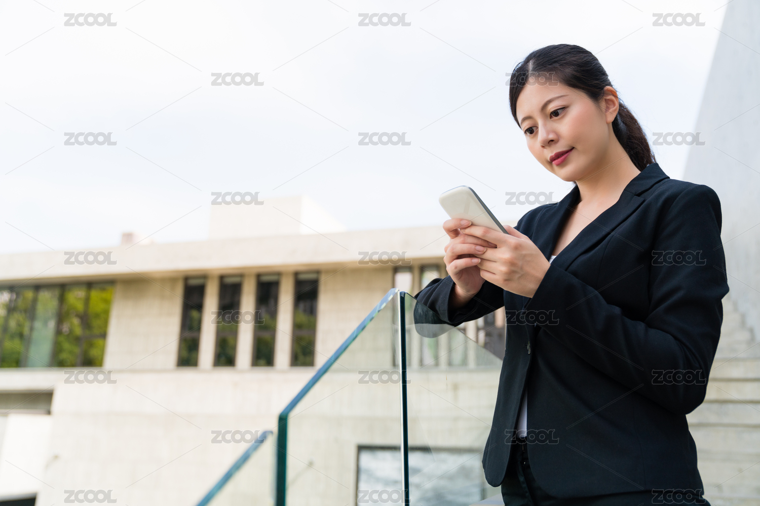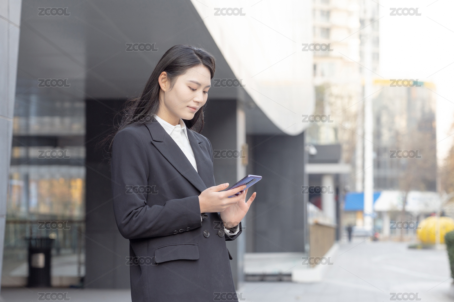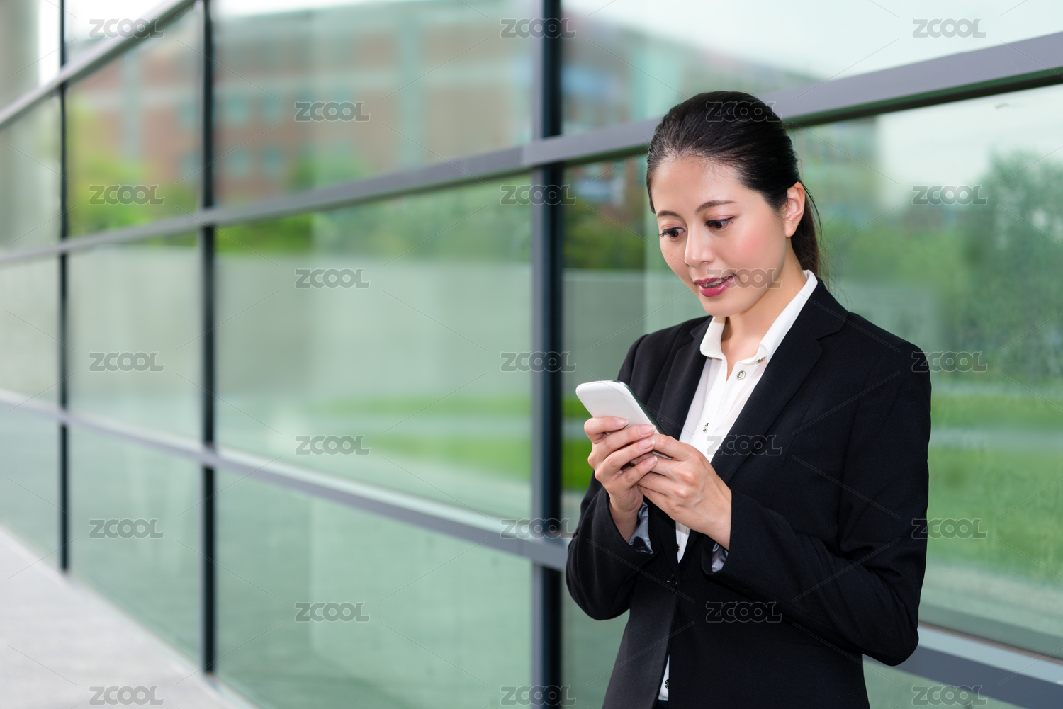 有吸引力的商业女人发短信消息发送给她的老板有一个友好的微笑黑色西装站在户外。