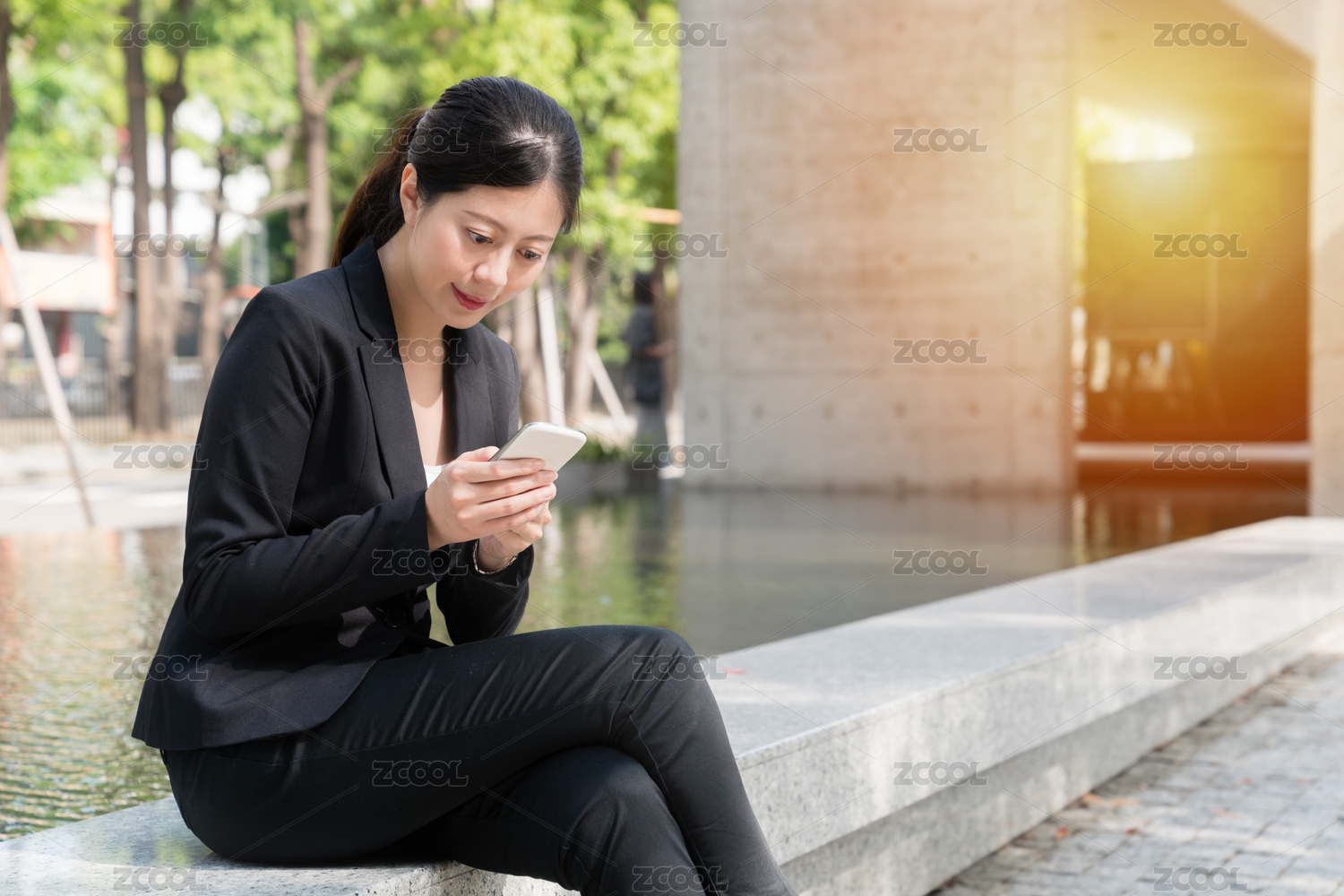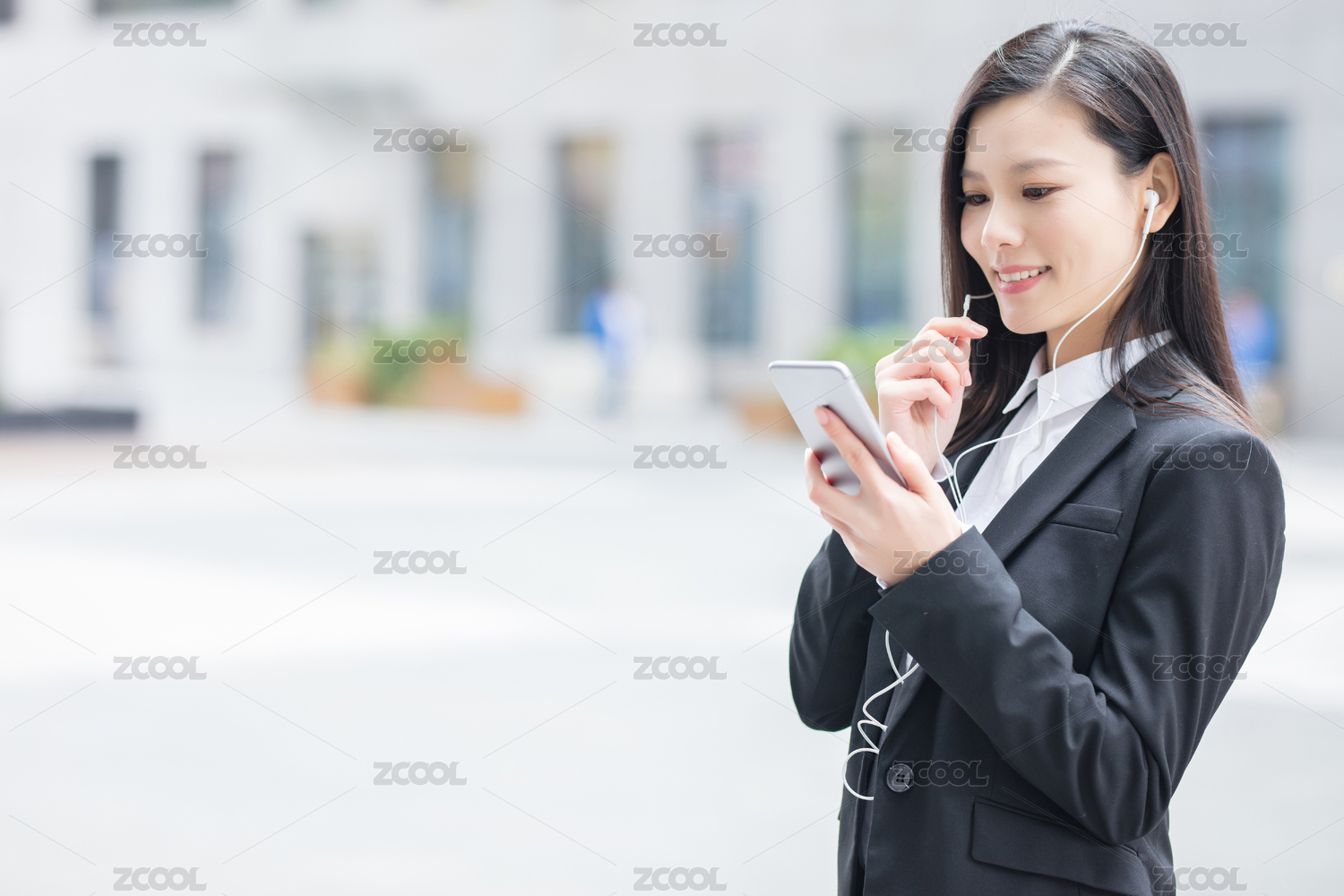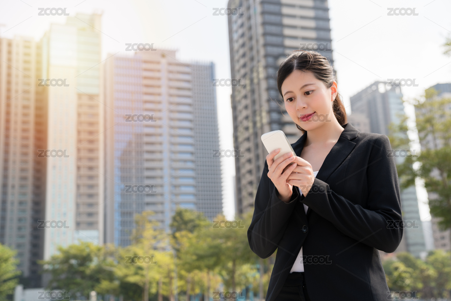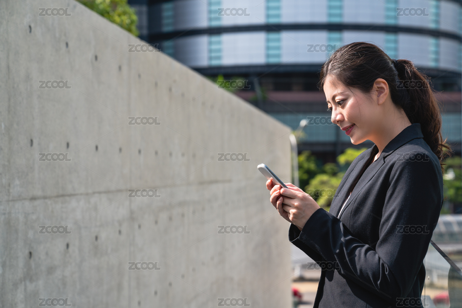 有吸引力的商业女人发短信消息发送给她的老板有一个友好的微笑黑色西装站在户外。
