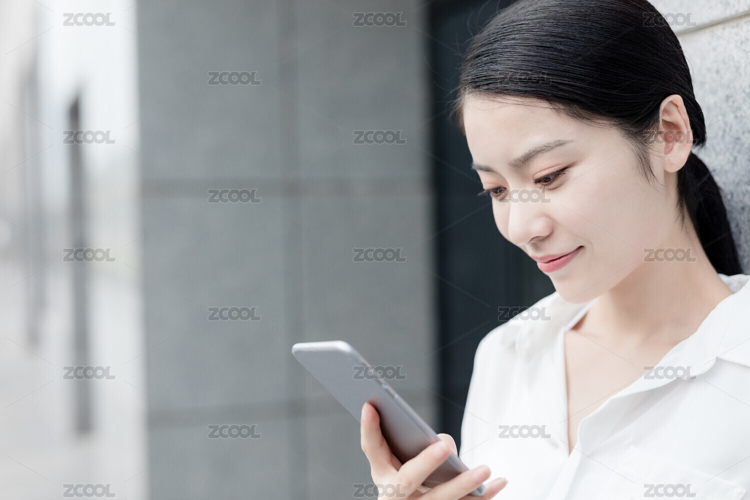 与智能手机专业年轻的亚洲发短信消息坐在办公室外。