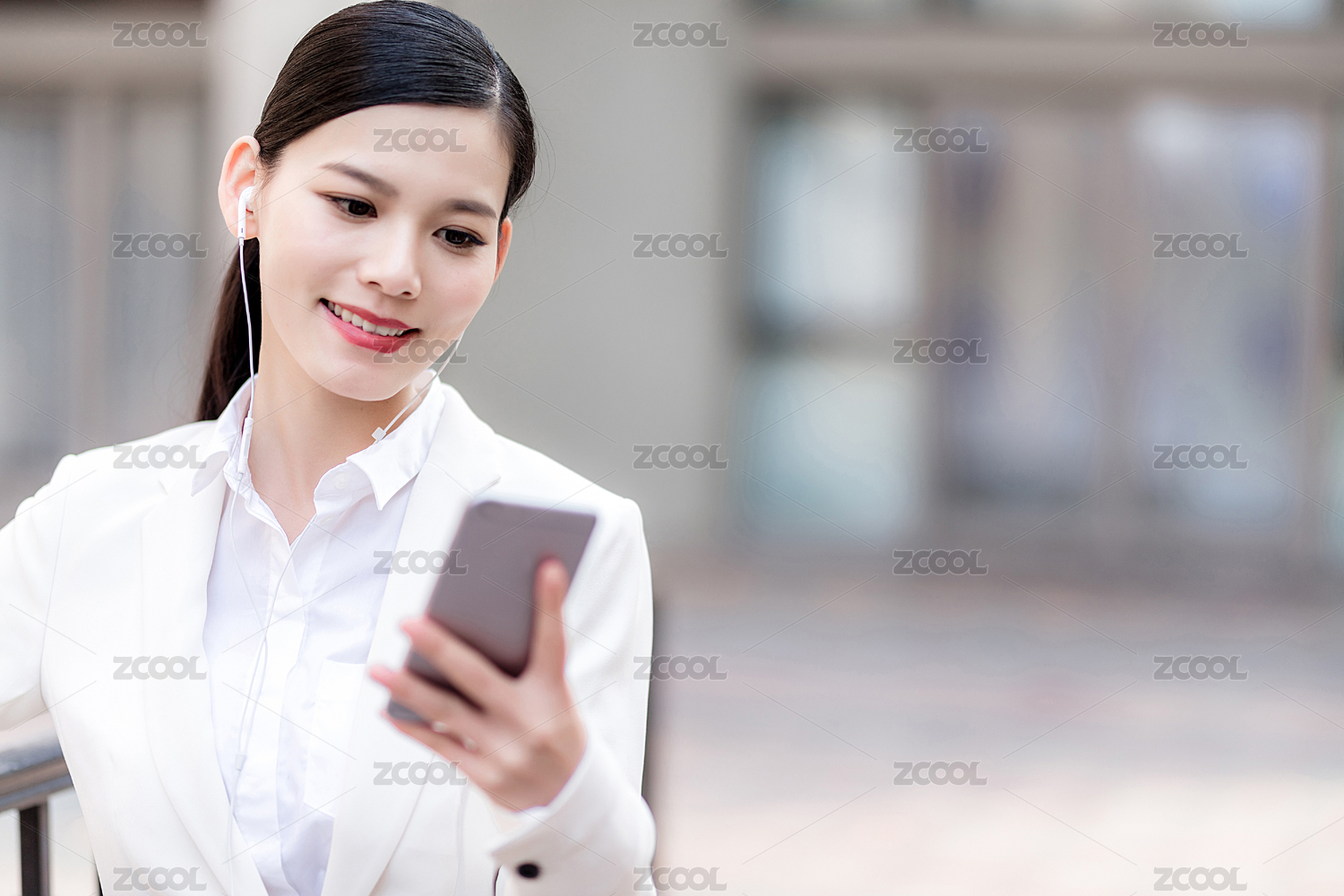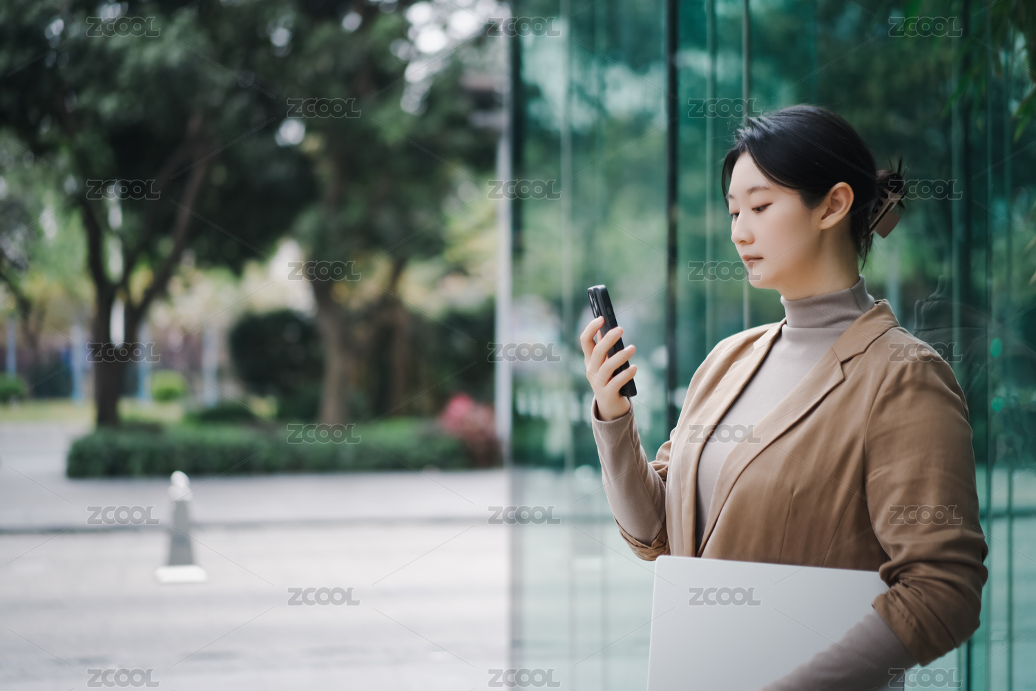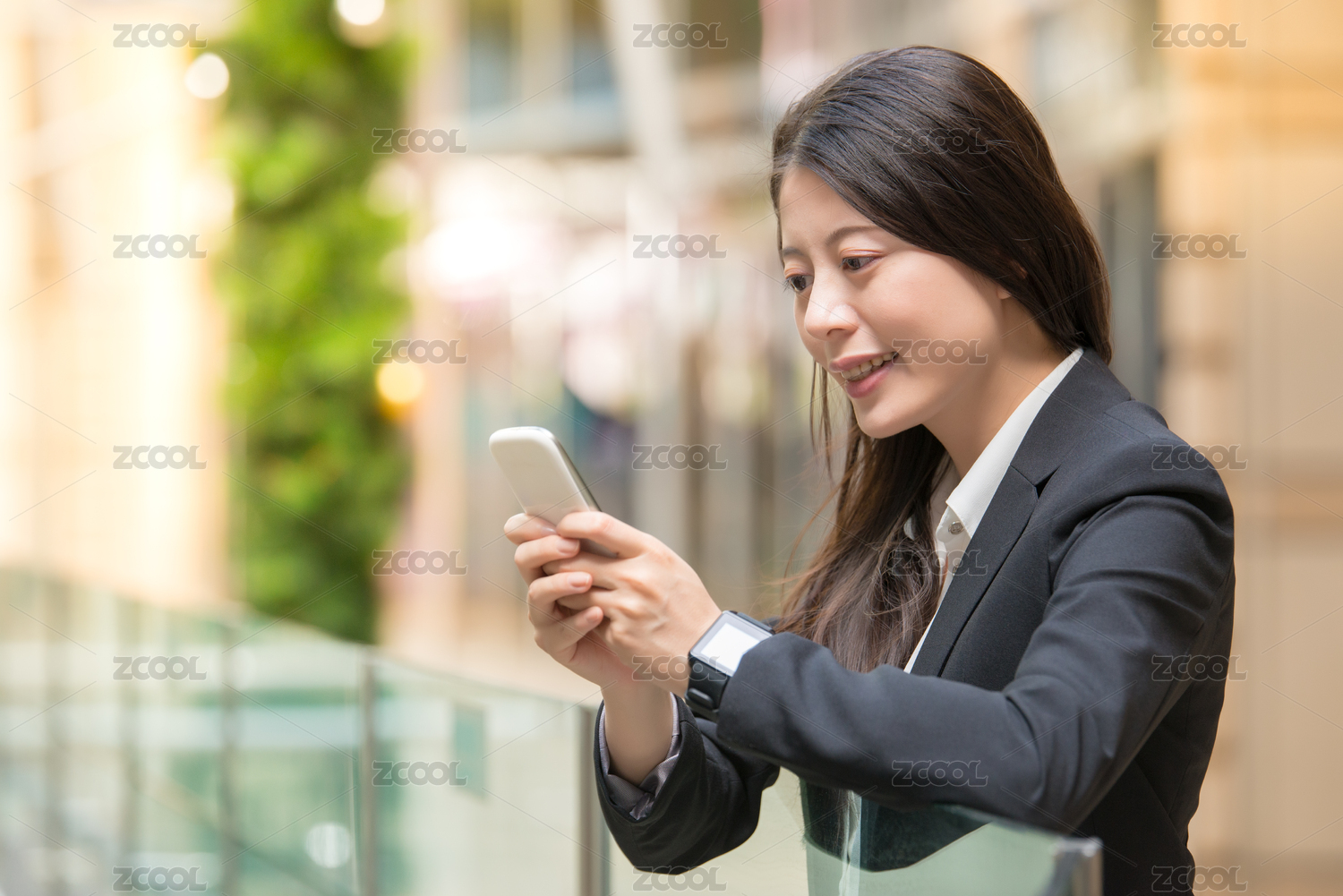 优雅的上班族女孩使用移动手机联络公司同事讨论站在城市建设的思考窗口室外走廊的工作进展情况。