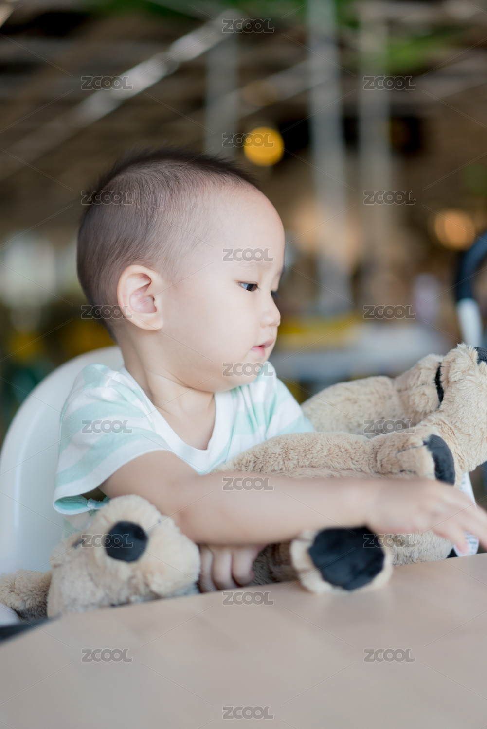 可爱的小男孩坐在餐厅的餐椅里玩耍