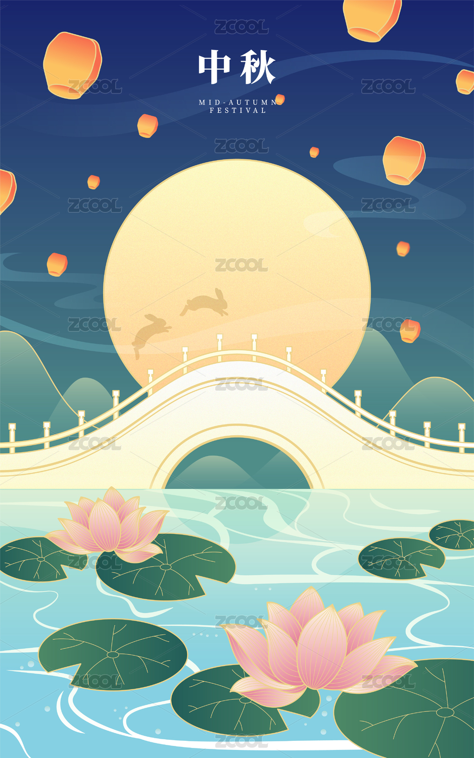 中秋节嫦娥和月亮玉兔荷花等竖版